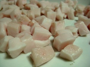 To make kampua mee at home, the most important ingredient would be the pork oil. The rest is pretty much secondary. So for the first time, I bought a block of pork fat home. Should have seen Frank’s reaction when I told him what it was! I opted to render the fat using oven method.