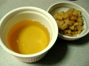 It’s really quite simple. Just spread the cubes on a shallow casserole dish, preheat oven to 150 degree and then put the dish in. In about 5 minutes you’ll start hearing the hissing and slight spluttering sound. Make sure you stir it once in a while and be careful of the spluttering (it’s no way near as bad as doing it on the stove though). After about 20-30 minutes you’ll have the delicious crispy lard and the oil. Just separate them. Like this.