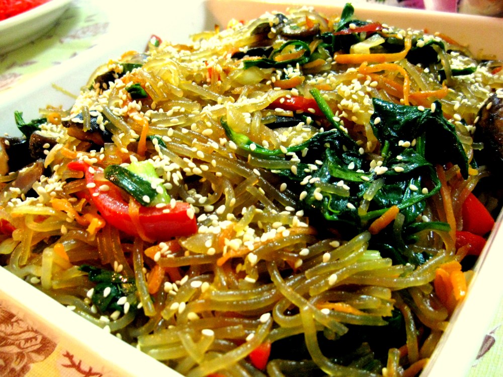 I’ve posted a recipe for Chap Chae previously, but this version is slightly more authentic, with added Spring onions, baby spinach, finished with sesame seeds. I’ve also used just light soy sauce instead of dark (made that mistake last time).