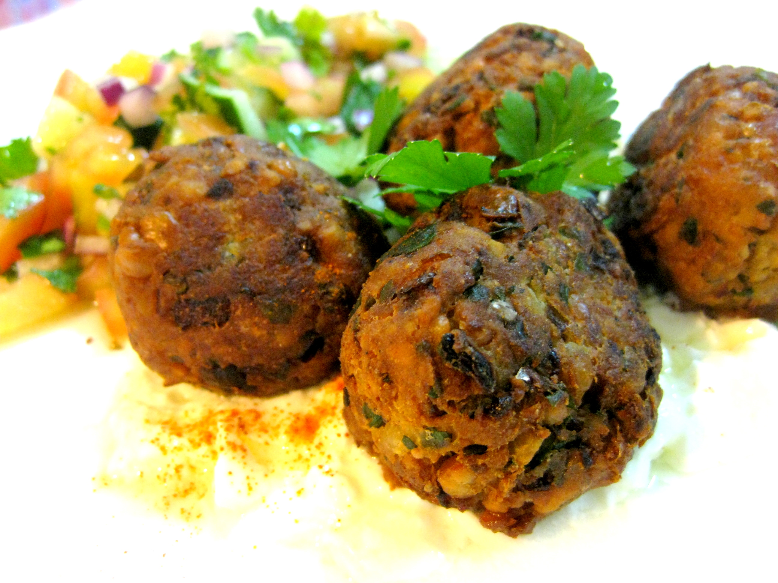 To assemble, spoon some natural yoghurt on the plate and place falafel balls on top. Sprinkle with some extra cayenne pepper. Garnish with extra parsley leaves. Place salad on the side. You can either serve the balls hot or room temperature.