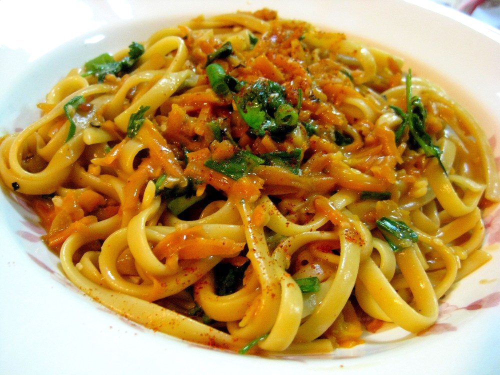 Cook the linguine in salted water until Al dente (although since this is Asian maybe just a little bit more than Al Dente, up to you) Add the carrot in for the last minute, just to soften up.