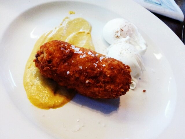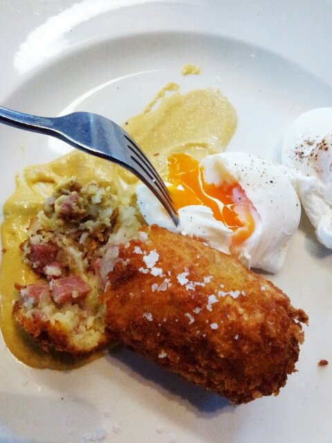 Just look at the eggs! So round and perfect and wait til you see the inside! Despite the seemingly small portion, it was quite filling. I love combination of the super crispy exterior with fluffy texture of the potato, laced with solid pieces of the mild tasting corn beef. Although the end that’s nesting on the dijon mustard was a little too salty. A little mustard goes a long way, I think. And the eggs! I’ll just show you a picture and you can see for yourself.