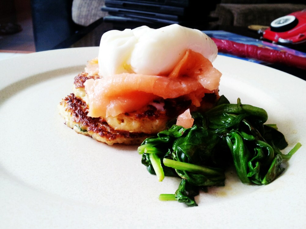 Poached Egg, Smoked Salmon, Quinoa Cakes and Wilted Spinach