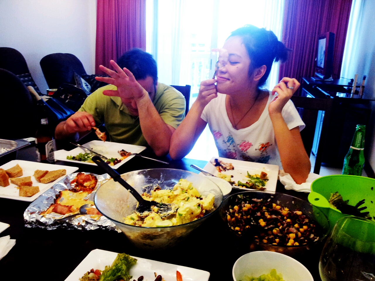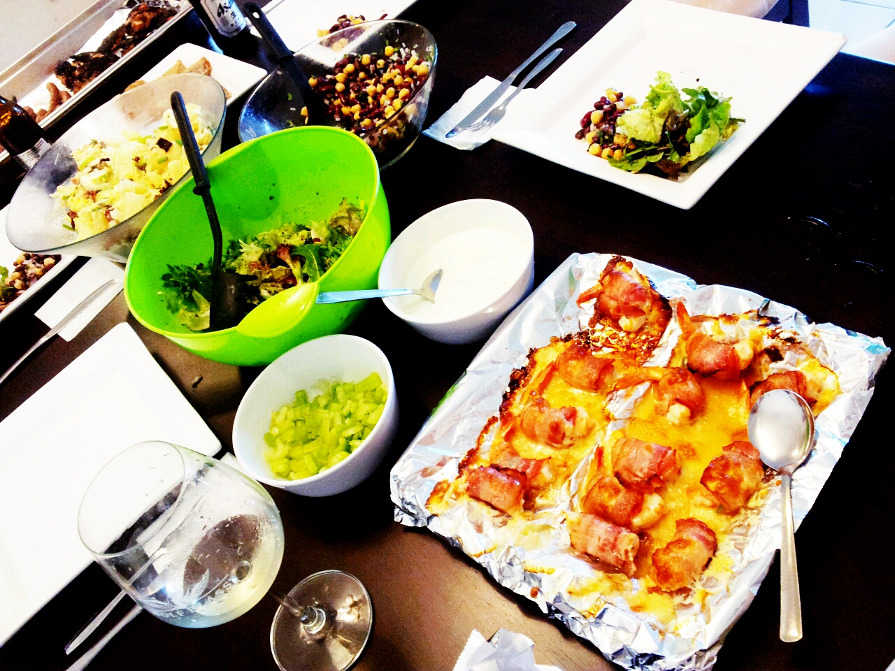 A while ago we had an impromptu BBQ party at a friend’s. Initially the idea was to make ‘tons of Buffalo Wings’ and plonk ourselves in front of the TV for movie marathon. But the idea soon transformed because we ‘discovered’ a rather unloved BBQ nestling at Ralph’s balcony. And with that, several other dishes were thought up including quite a few salads and this particular item that I’m immensely proud of: Prawns in Blankets. Cheesy ones, even.