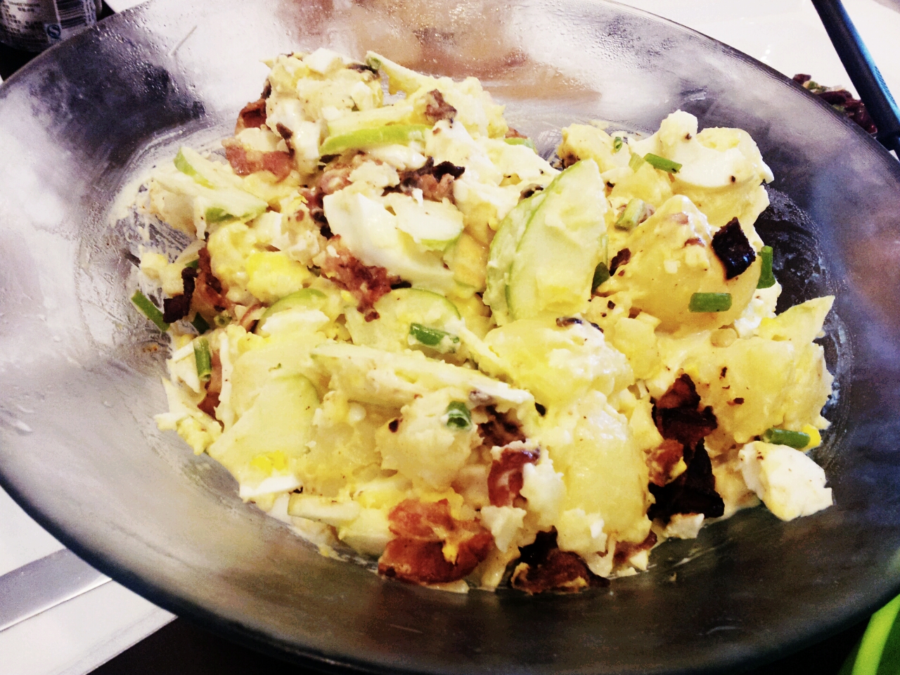 Soft potato pieces, apple slices, hard boiled eggs, crispy bacon bits and spring onion dressed by Japanese Mayonnaise, English Mustard, Lemon Juice, Salt and Pepper. Perfect.