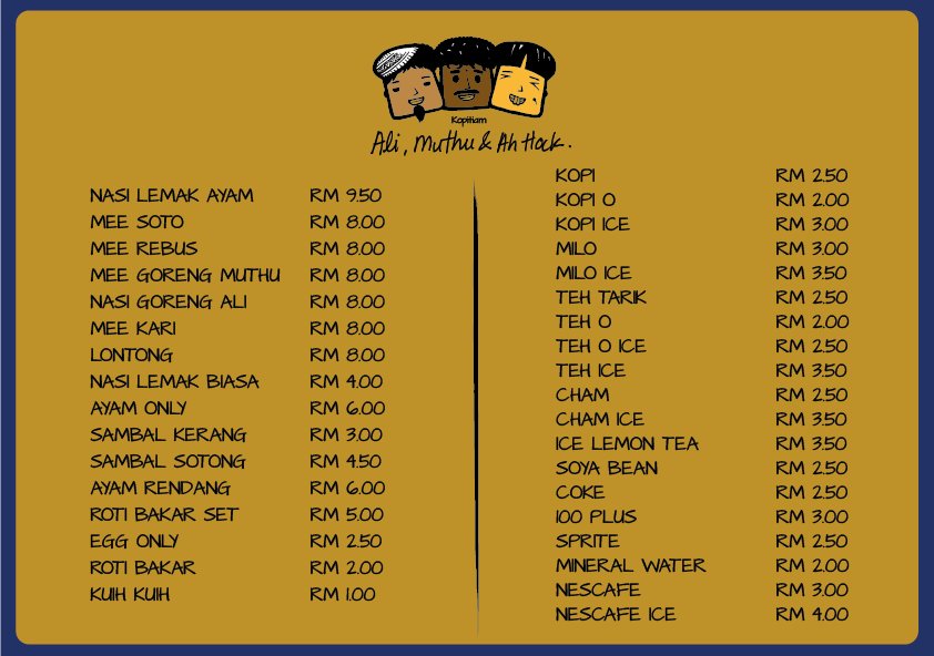 Hehe what a cute name for the restaurant. At first, I glanced through the photos and thought you made 3 types of noodles (Malay/Chinese/Indian) and calleed them Ali, Muthu and Ah Hock. Haha!!