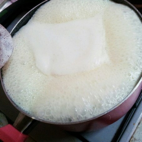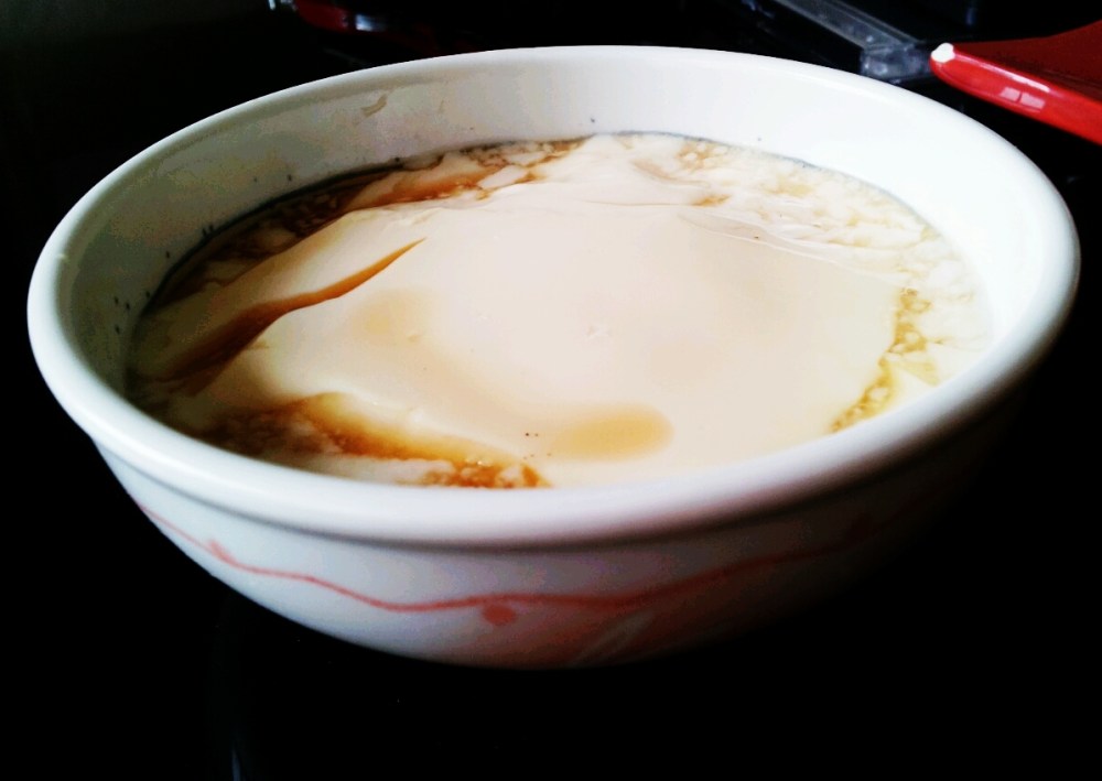 While this is all happening, take a small bowl of hot water and sprinkle one heap teaspoons of gelatine over. Mix well. Pour the mixture into the bowl or container you are going to make the Tau Huay in, and add the soy milk, stirring vigorously to mix. The ratio is about 300ml soy milk to one teaspoon. Remove the bubbles and send the mixture to the fridge and chill overnight.