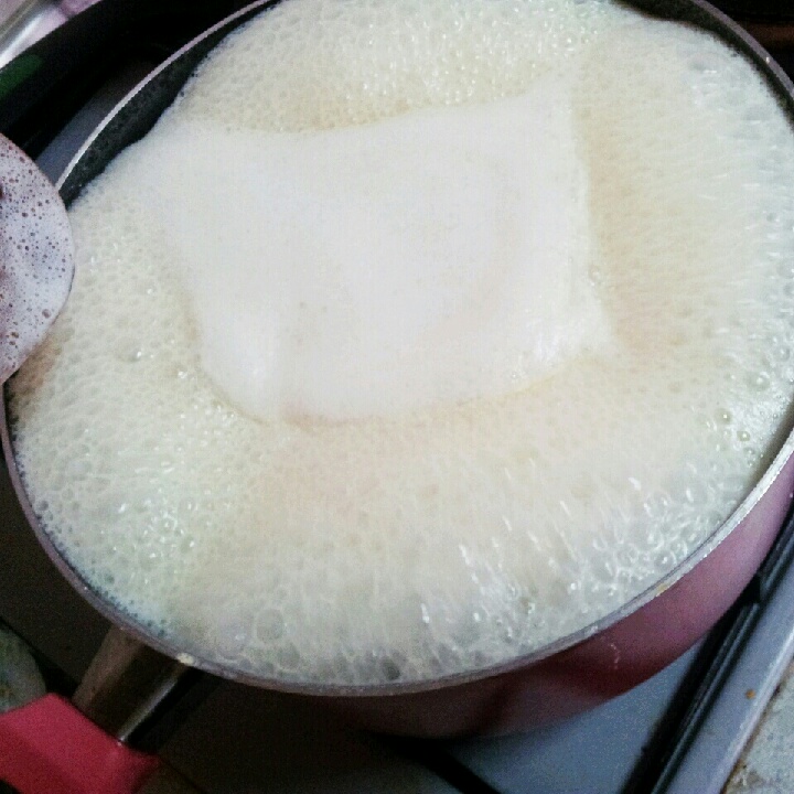 To make Tau huay at home, it’s advisable to make your own soy milk. That way you can make it thick, and it would be easier to set. Making soy milk is easy! All you need is a blender and a pair of strong hands to extract the milk. I’ve used 250g of organic soy beans with about 1L of distilled water. Soak the beans overnight, removed as much husk as possible the next day and plonk everything into the blender to blend til smooth. Pour the mixture into a muslin/cheese cloth and start squeezing all the liquid out. Then you get this: