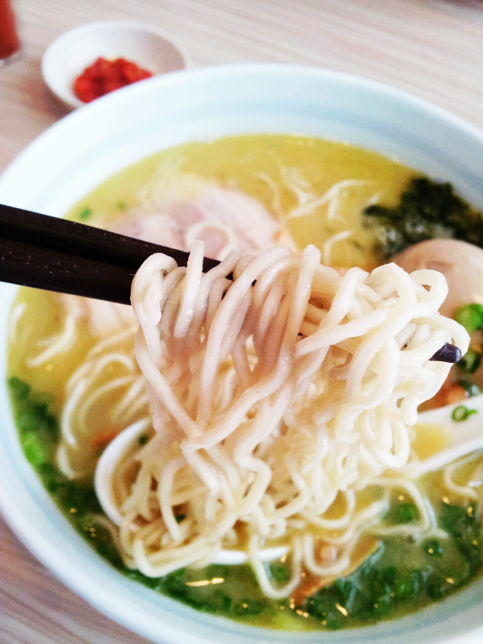 The Toripaitan broth, a milky-white 100% chicken broth (MSG-Free) which have been meticulously cooked for over 5 hours, is really quite amazing. Full of chicken essence with plenty of umaminess but definitely not as cloying as the usual Tonkotsu broth. Salt level was absolutely perfect. At first glance, you wouldn’t think it’s spicy at all, but the broth definitely packs quite a bit of a punch. I should also mention that the chili they serve on the side is homemade and really quite spicy! So approach with caution. I added plenty of fried garlic too, for that extra punch of flavour.