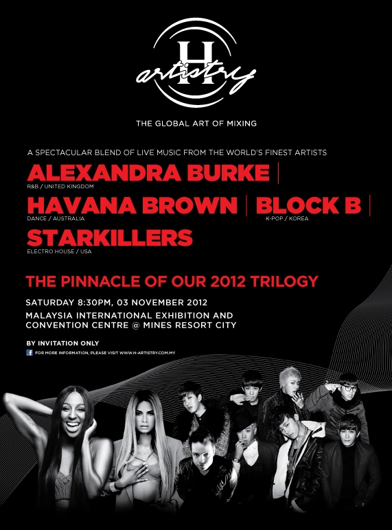 Well, I’m sure you all want to know who would be taking the stage for this installment of H-Artistry. I’m particularly excited about Alexandra Burke who’s the Winner of X Factor and UK’s R&B darling. This will be the second time I get to see Australian DJ vixen Havana Brown (last time being Britney Spears’ Melbourne Concert). In the boys department, we have K-Pop boy band heartthrobs Block B, and Las Vegas’ edgiest DJ Starkillers a.k.a. Nick Terranova.