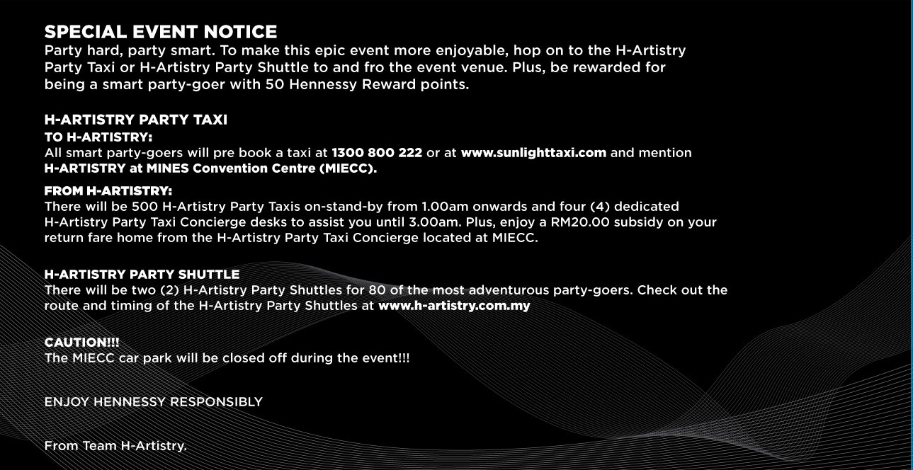 I heard that there won’t be any parking at the venue though, but don’t fret as there will be FREE Party Shuttle (check out www.h-artistry.com.my for more details) and subsidized H-Artistry Party Taxi services (Visit www.sunlighttaxi.com or call 1300 800 222 to book your ride). So you can party hard and party smart! Don’t even need to worry about a designated driver, brilliant!