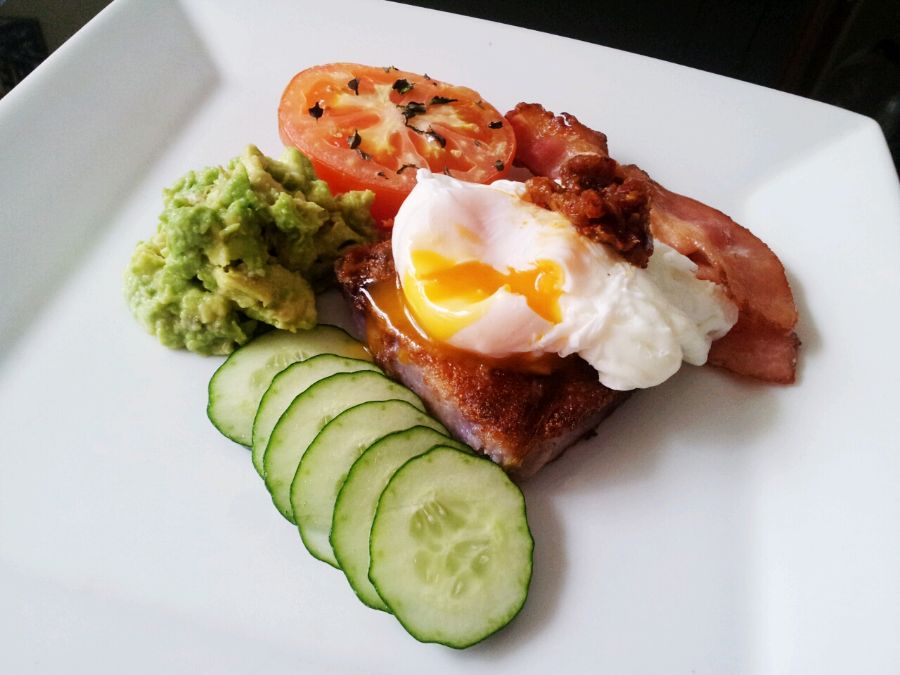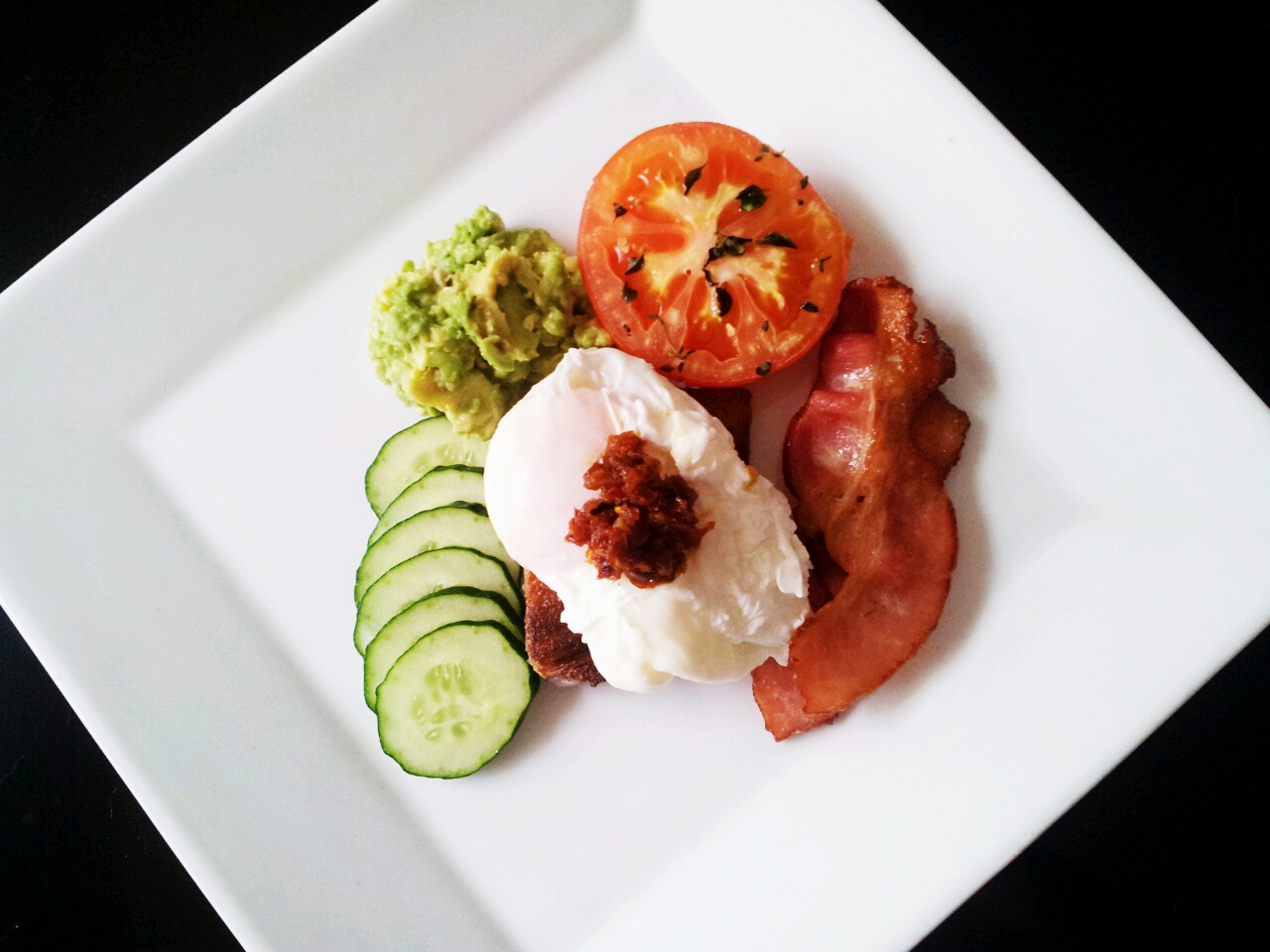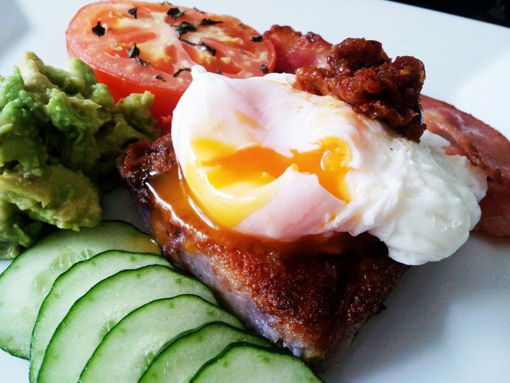Poached Egg, Purple Carrot Cake, Cucumber, Smashed Avo, Slow Roasted Tomato and Bacon topped with Sambal.