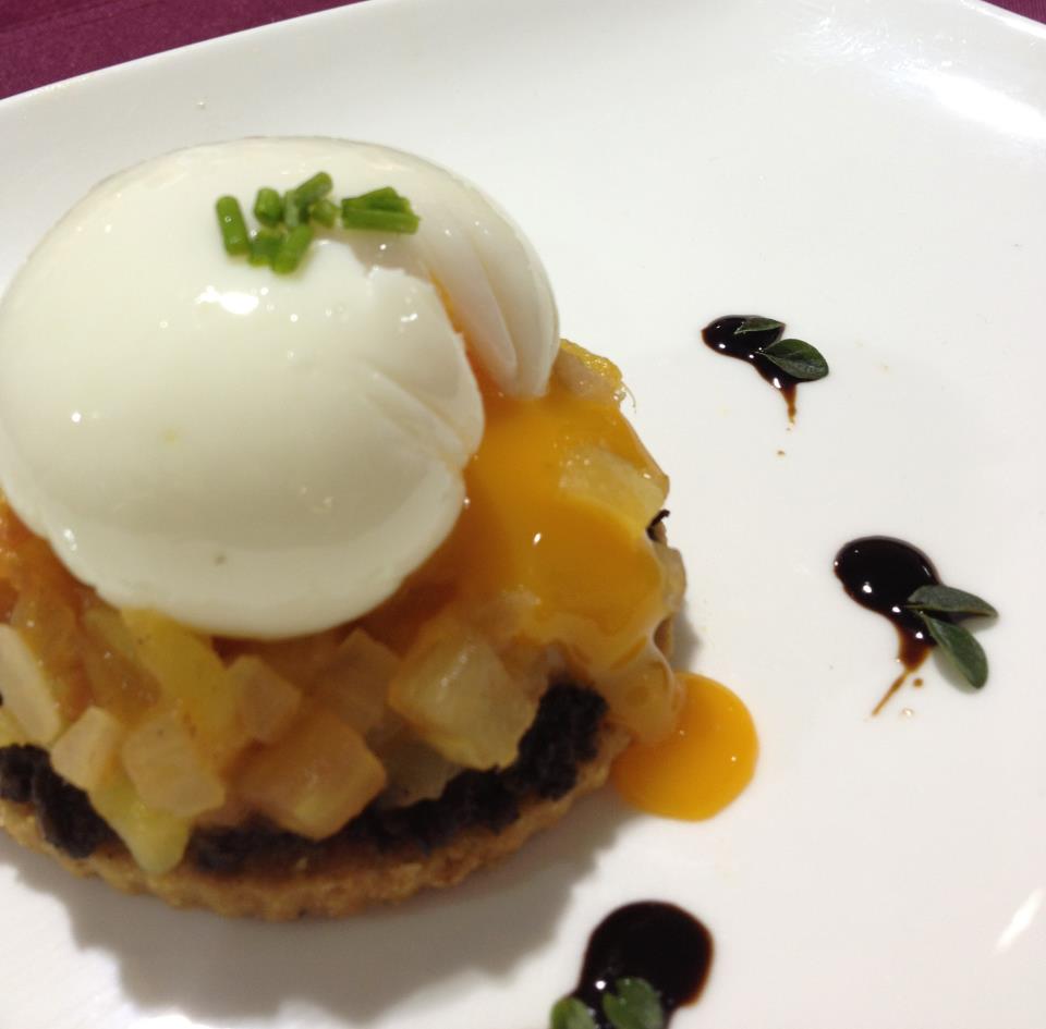 Pineapple and Tomato tart with Poached Egg, Olive Pâté and Balsamic Reduction