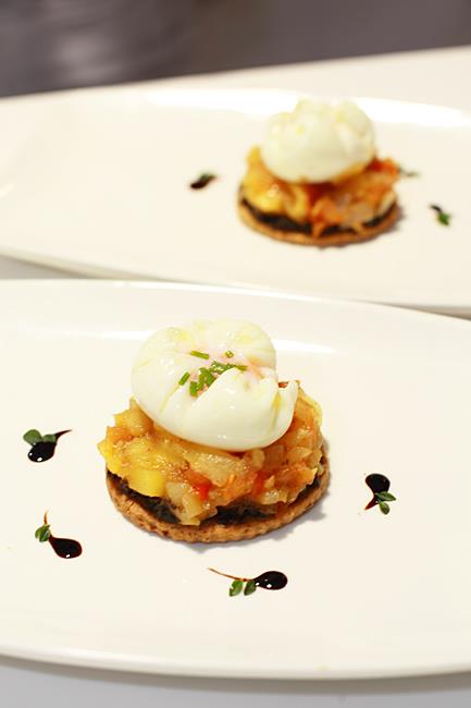 First, place the tart on plate, smear the olive Pâté thinly, place the pineapple and tomato chutney, then slowly slide the egg on top.