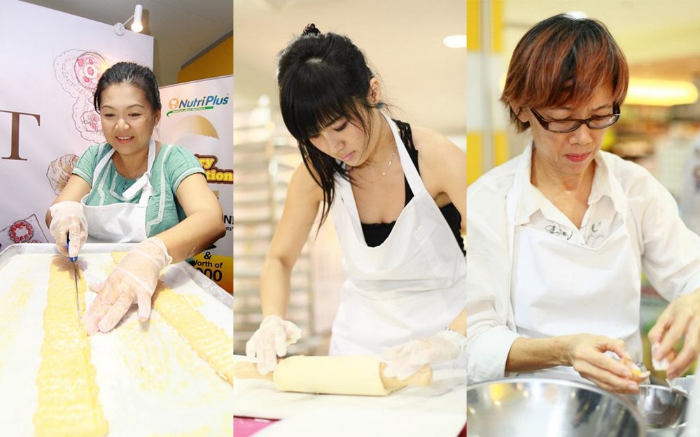 From Left: Wendy cutting her Sponge Fingers for her Watermelon and Lime Charlotte, Jeyeng rolling her Danish Pastry, Gan making her Mango Pago