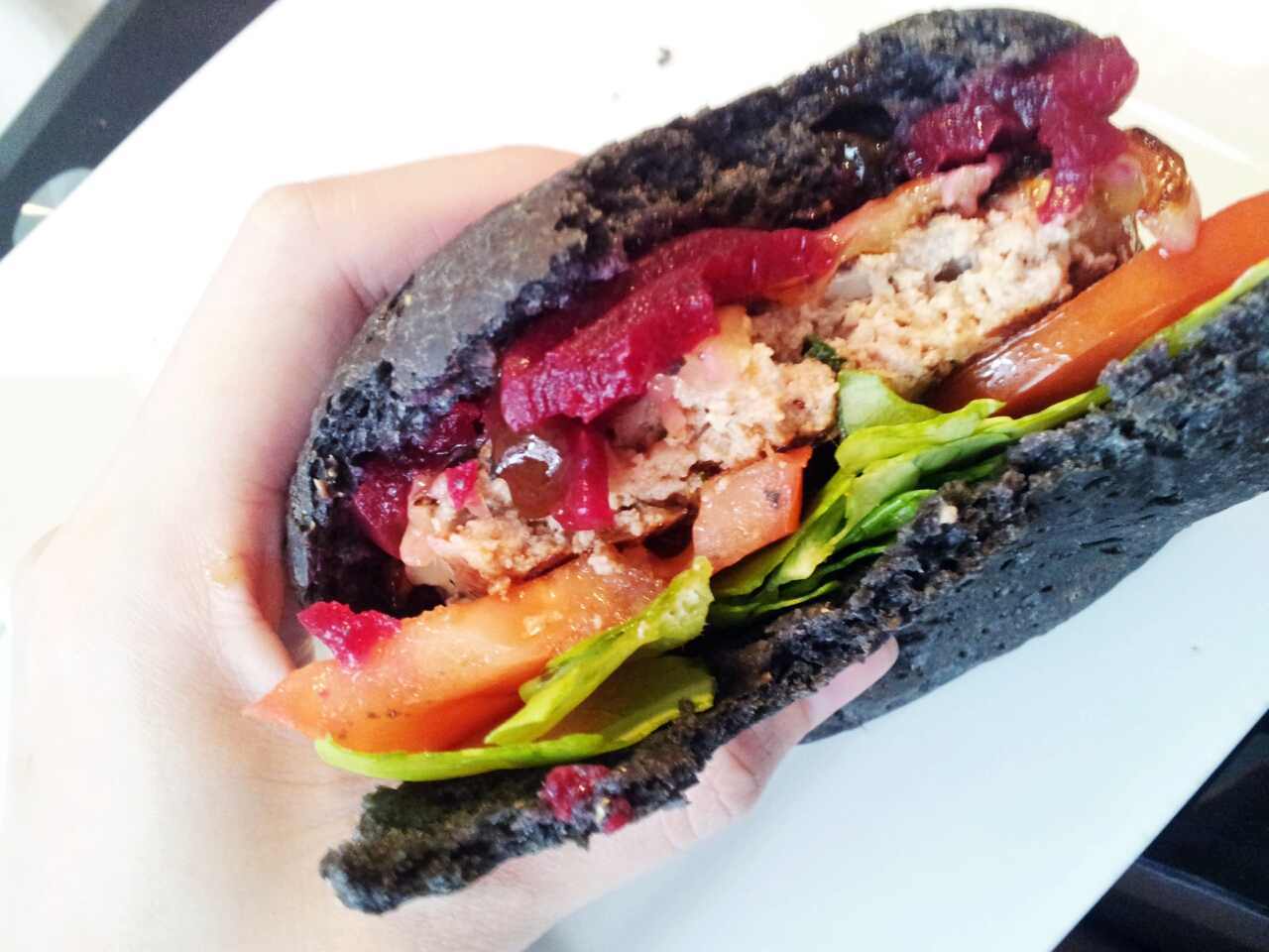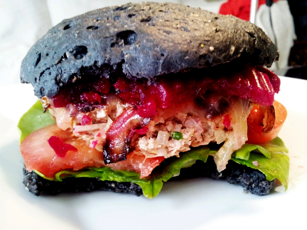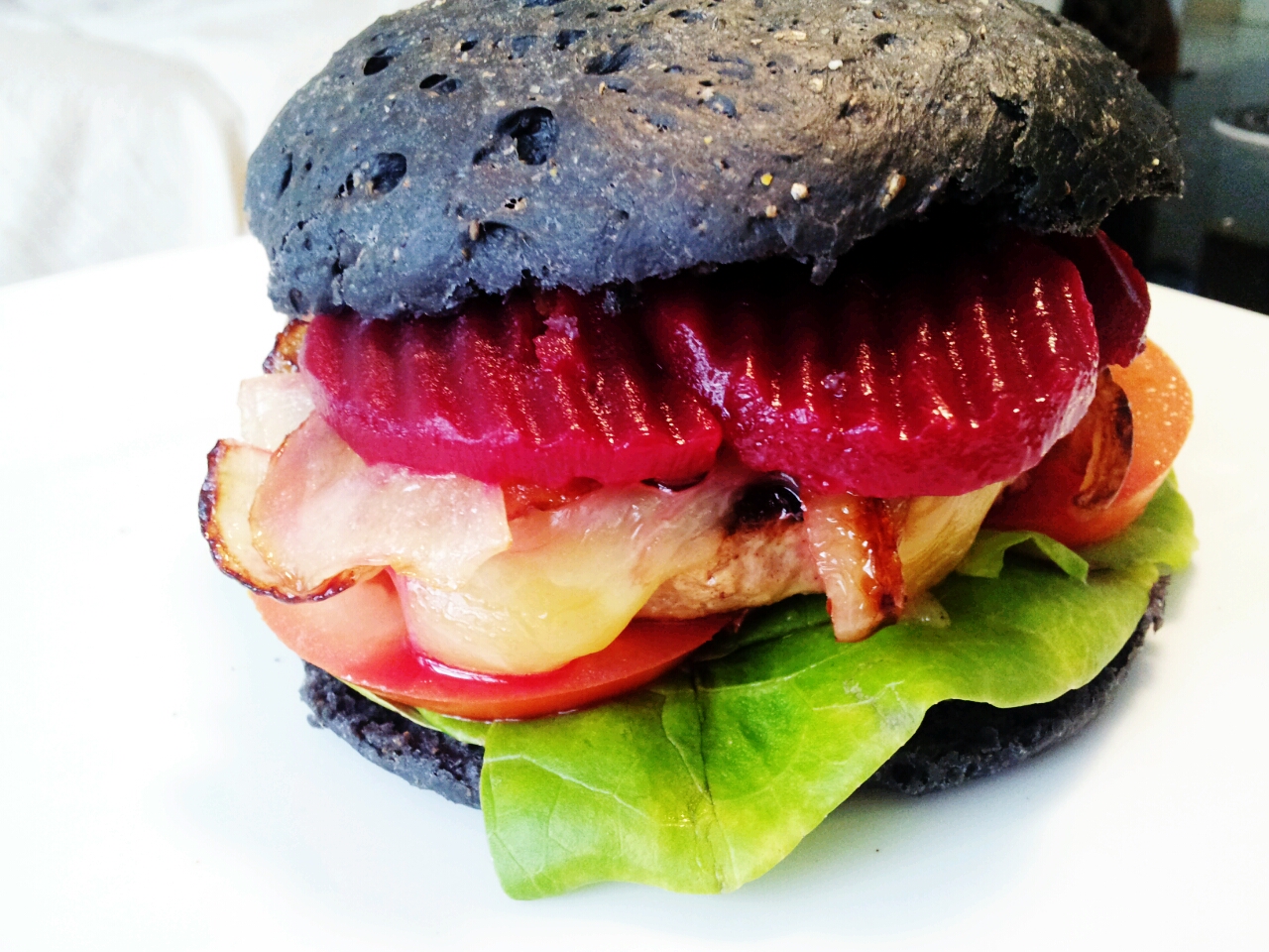 The beetroot adding a beautiful colour to the burger, nice contrast with the black bun too!