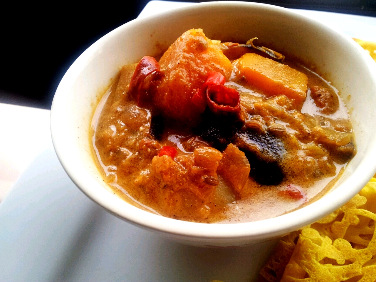 Add tomatoes and saute for 2-3 minutes for the juices to release, follow by Eggplant (1-2 minutes), Potato, and then Pumpkin (cooks the fastest so goes in last). Once all the vegetables are nicely coated with spices and slightly browned. Add fresh chili, pour in stock and coconut milk. Cover and simmer for 15-20 minutes, adding water as required. The curry is ready when potato and pumpkin pieces are tender.