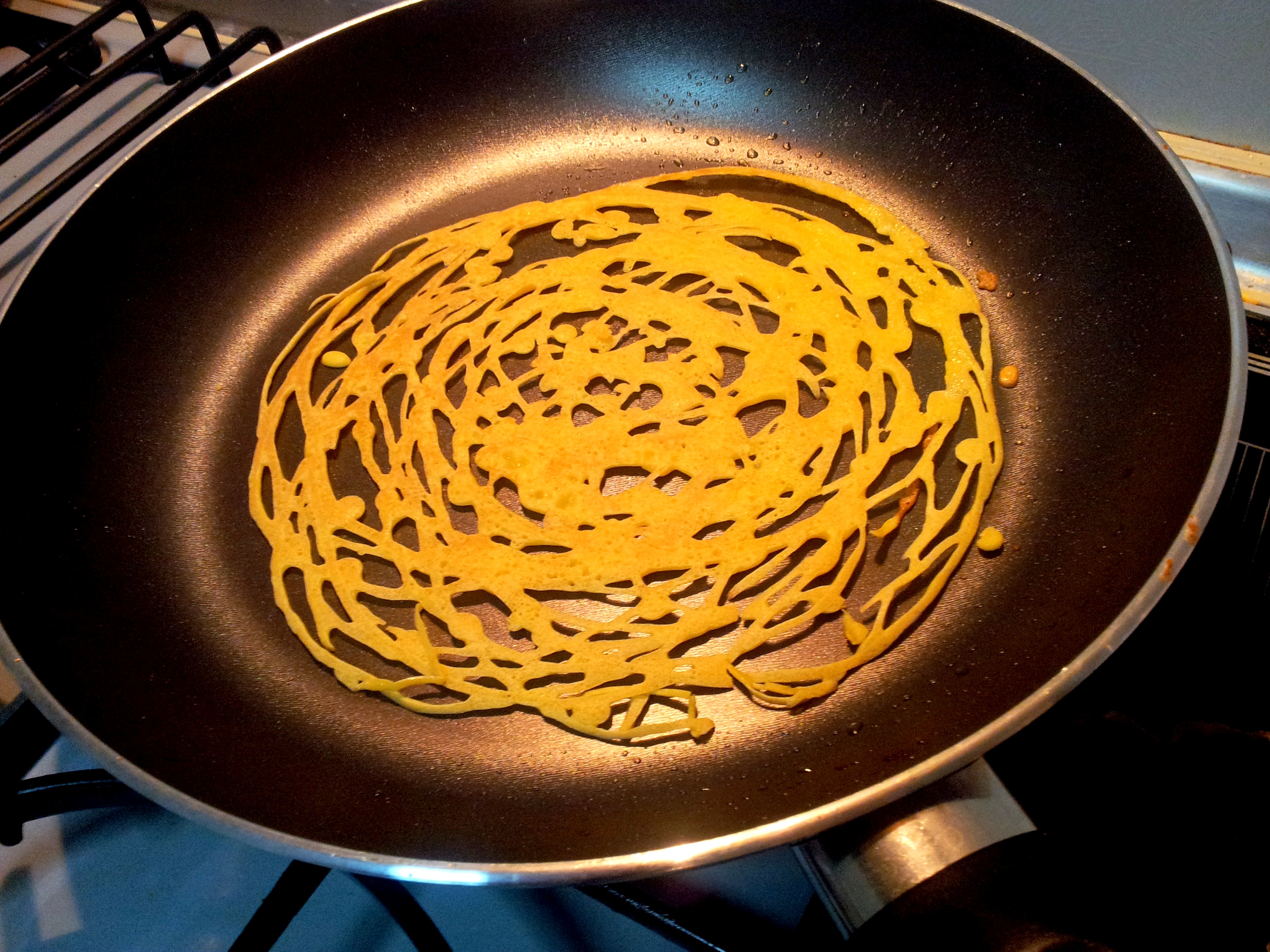 *Note that if you can’t get hold of a roti jala mold, you can punch a few holes at the bottom of a plastic bottle, milk carton, tin can, or just use a squeeze top (this will take longer so turn the heat to low while doing so).