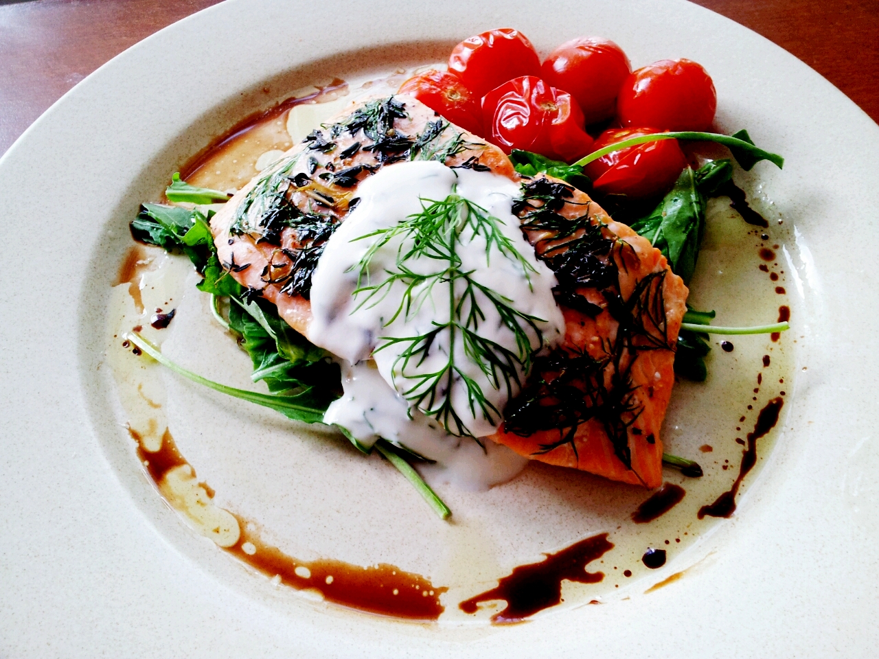 When the salmon is done, rest for a minute or two. Toss wild rocket leaves with lemon juice and place on the plate. Then place the fish on top of the leaves, cherry tomatoes on the side, finish with the dill yoghurt sauce, and a drizzle of balsamic vinegar and olive oil round the place.