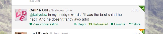 Together with my Shakshouka (Poached eggs in Spicy Pepper Sauce), Bacon & Mushroom Quiche, Rocket Salad and Homemade toast; this was served on my table for Celine‘s family. I had only a tiny portion of it and thought it was quite lovely. With the sweet and tangyness from the fruits, the aromatic coriander and just a touch of savoury note, it was gone pretty quickly and this was the feedback: