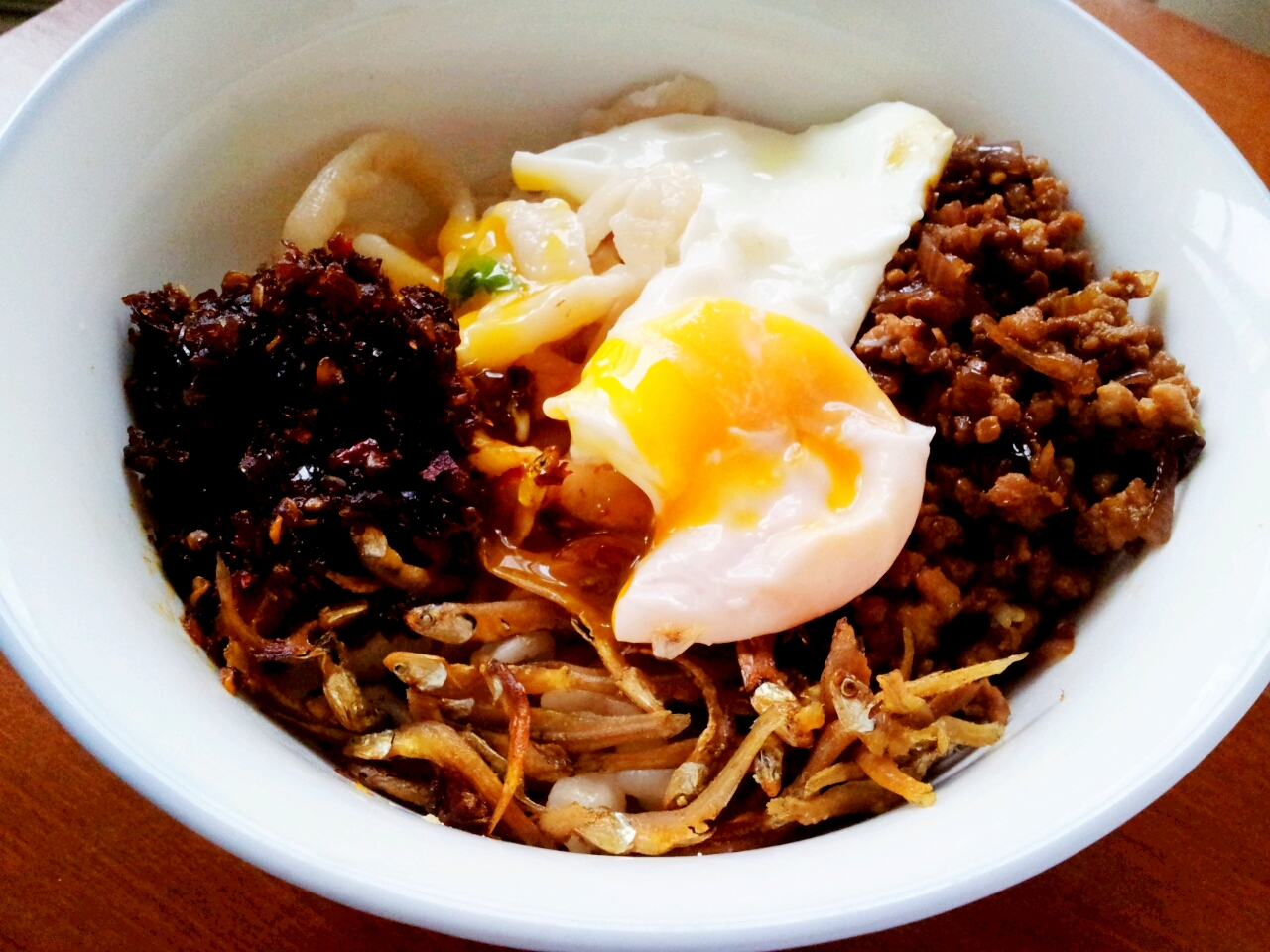 Arrange the meat sauce, poached egg, some fried anchovies and spoonfuls of chili paste on top of the noodles (you can always add more chili paste as needed), serving with the soup on the side. You can also sprinkle some spring onions on top of the noodles (but I happened to use up all of it the day before).