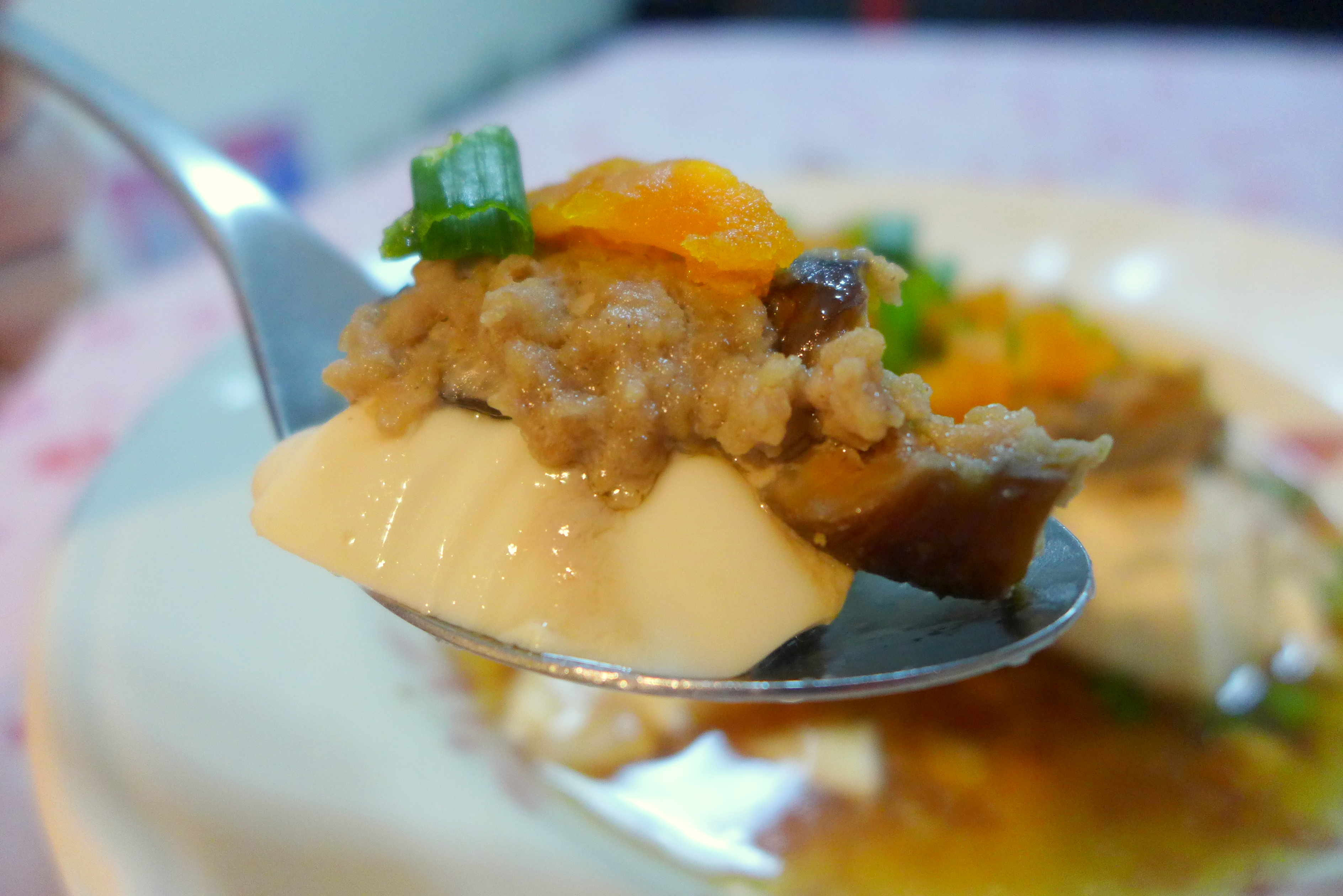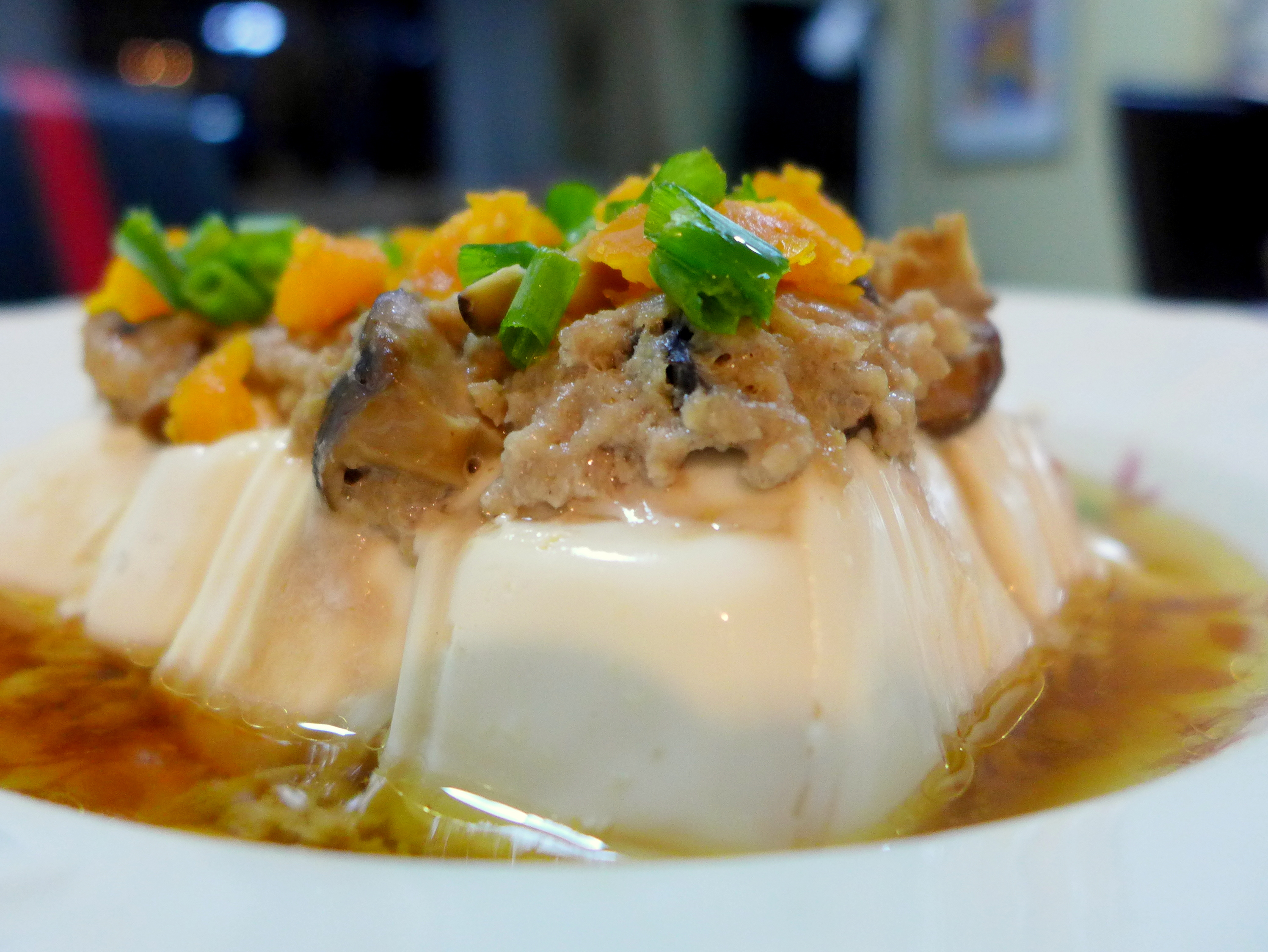Steamed Tofu with Minced Pork, Mushrooms and Salted Egg Yolk.