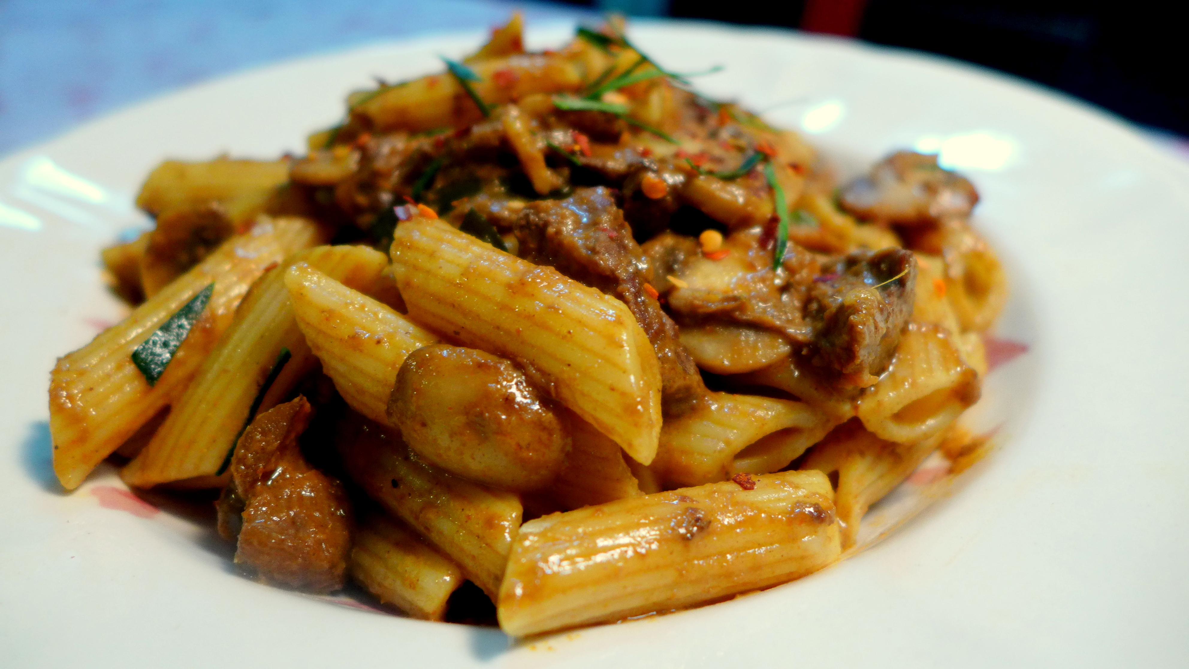 In a skillet, melt the butter and saute mushrooms until golden. Add cream, follow by beef rendang and half of the kaffir lime leaf. Once the beef rendang is fully heated up, carefully break the beef into smaller pieces. This whole process should take just over 10 minutes, which is exactly the time the penne needs. Once the pasta is ready, drain (reserving a little bit of the pasta water) and mix well with the sauce. Loosen it with pasta water if needed. Serve immediately and garnish with more Kaffir lime leaf and Chili Flakes.