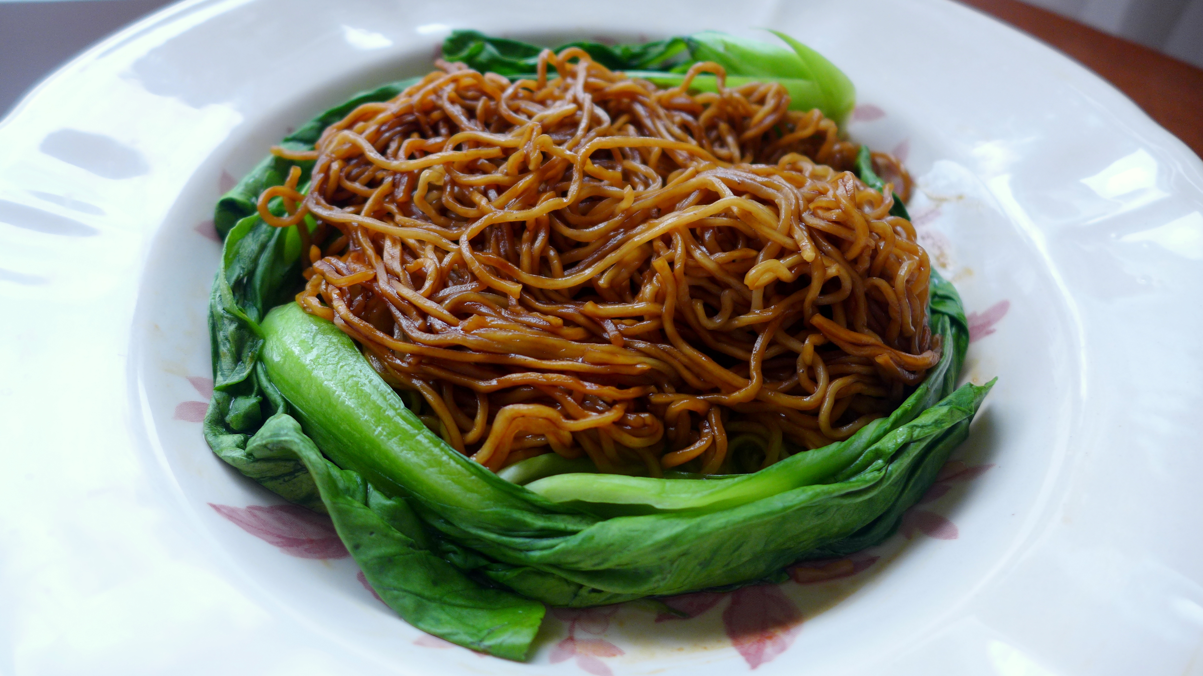 Loosen single portion fresh egg noodles/fresh wantan noodles. Put the noodles in a noodle strainer. Cook in boiling water for 15 seconds. Rinse it under running tap water. Blanch it again for another 15-30 seconds depending on the thickness of noodles. Put noodles in a plate. Top with 1 Tbsp of renderings, some dark caramel sauce (or dark soy sauce), light soy sauce according to taste. Toss the noodles. Garnish with some blanched baby bok choy or mustard green.