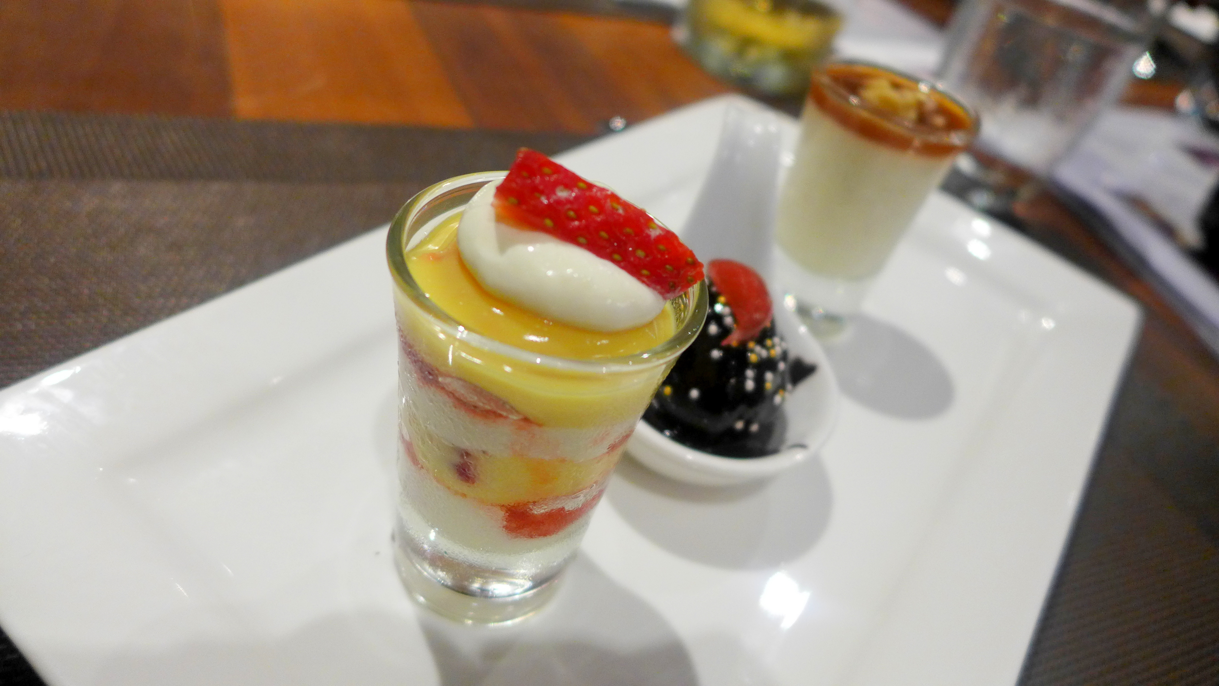 A trifle is created with layers of fresh cream, custard, strawberries (or other fruits) and some sort of coulis (strawberry, in this case). It’s not my favourite dessert so this was just ok. Maybe a tinge of citrus would help me like it more.