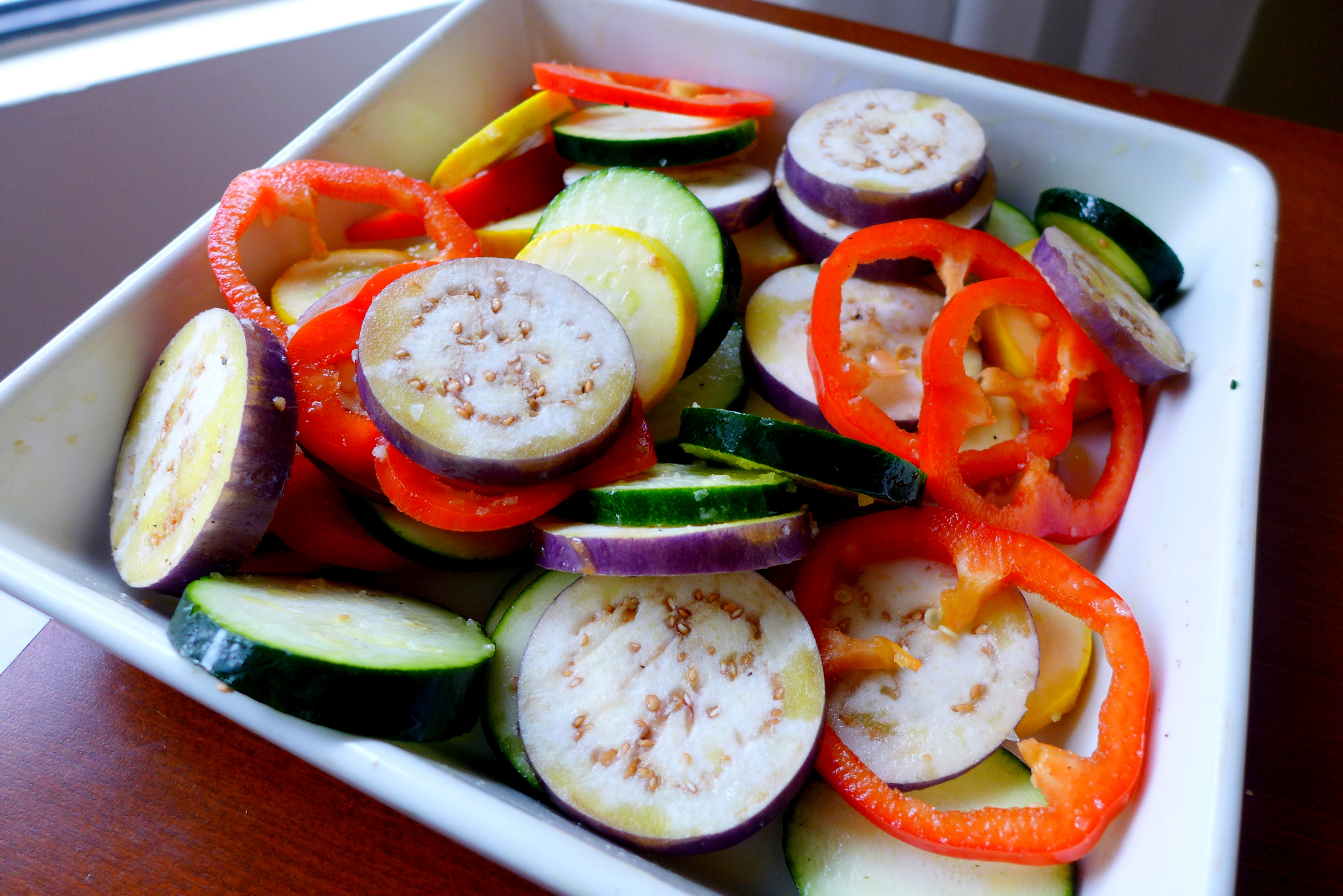 Cut all the vegetables into equal sizes (thin rounds). Marinate the Yellow squash, zucchini, eggplant and red capsicum in some olive oil, salt and pepper for at least 10 minutes.