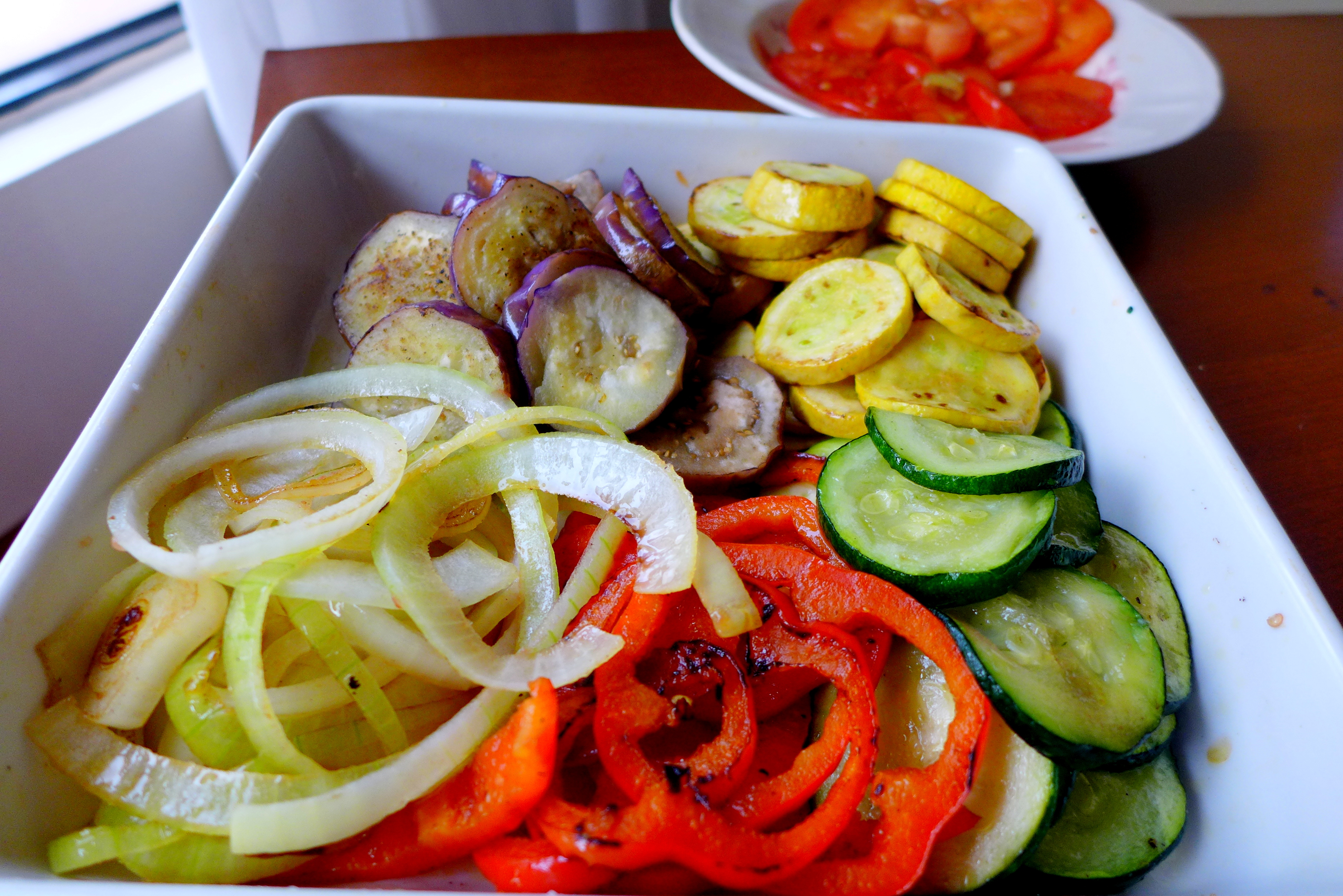 Grill or pan fry all the vegetables until tender. Set aside to cool.