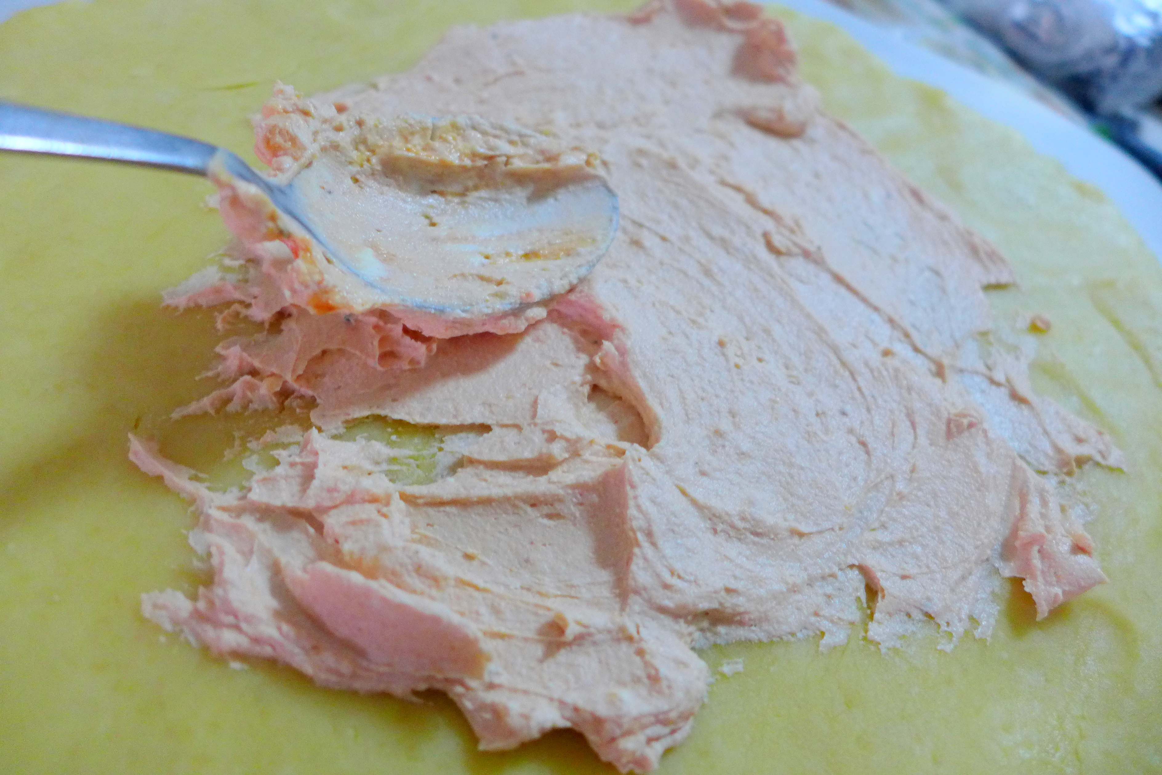 Roll out the pastry to about 13-14 in diameter (I didn’t really measure, it was just the same size as my mini lazy susan, hehe) Spread the cream cheese mixture on top, sparing about 2 inches around the edges.