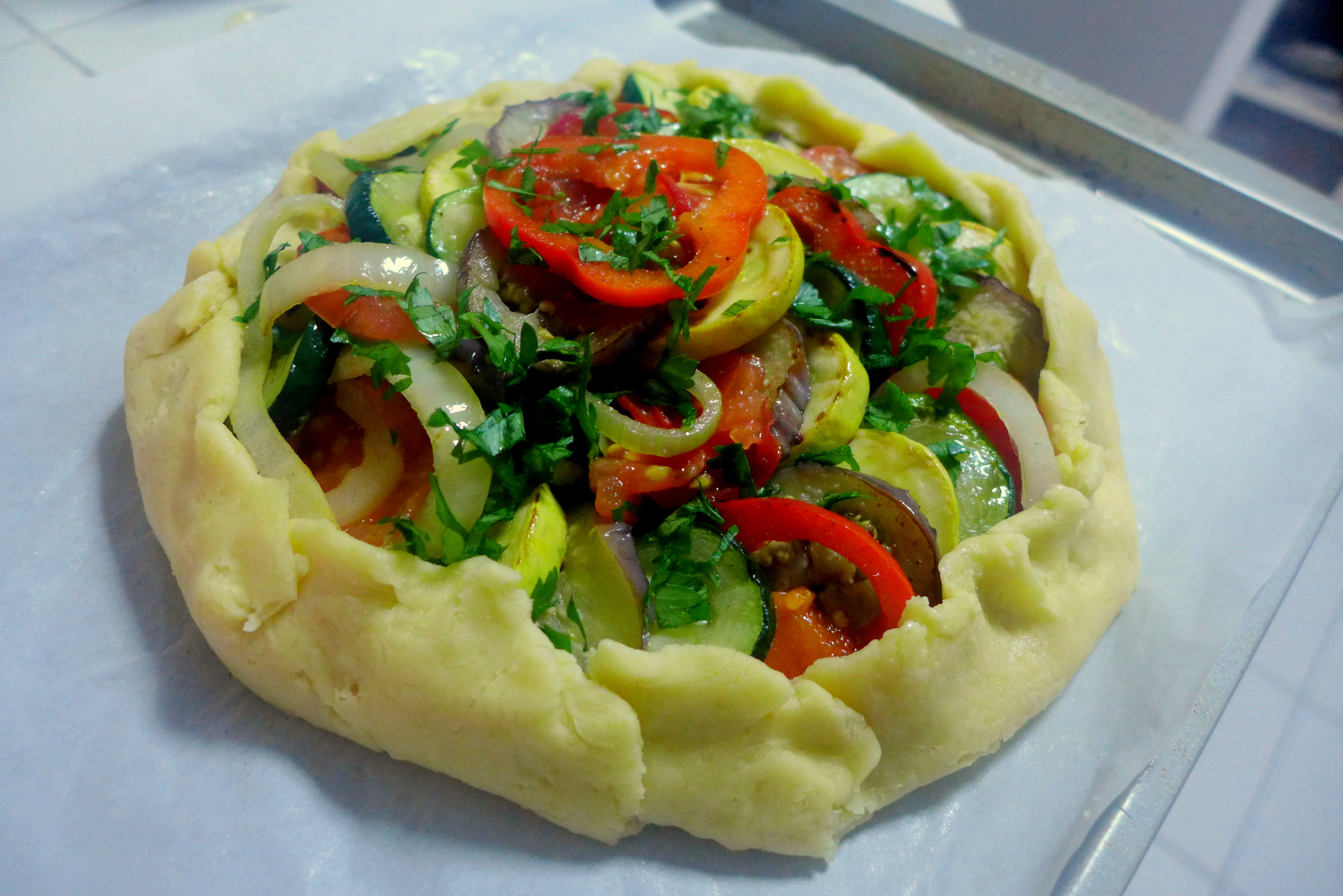 And you know me, I almost never stick to a recipe 100%. Yes I’m rebellious that way, but also I happen to like my pastry very much (adding almond meal is always going to improve the taste). She uses Goat cheese in her recipe and I couldn’t find any decent ones in my local supermarket (some iffy brand in cheap looking package..eurghh) so I thought cream cheese would work too. I added some tomato puree because I felt that this recipe needs a little bit of acidity to balance the taste (some lemon juice would work very well too I think). So here’s my take on the Ratatouille Galette.
