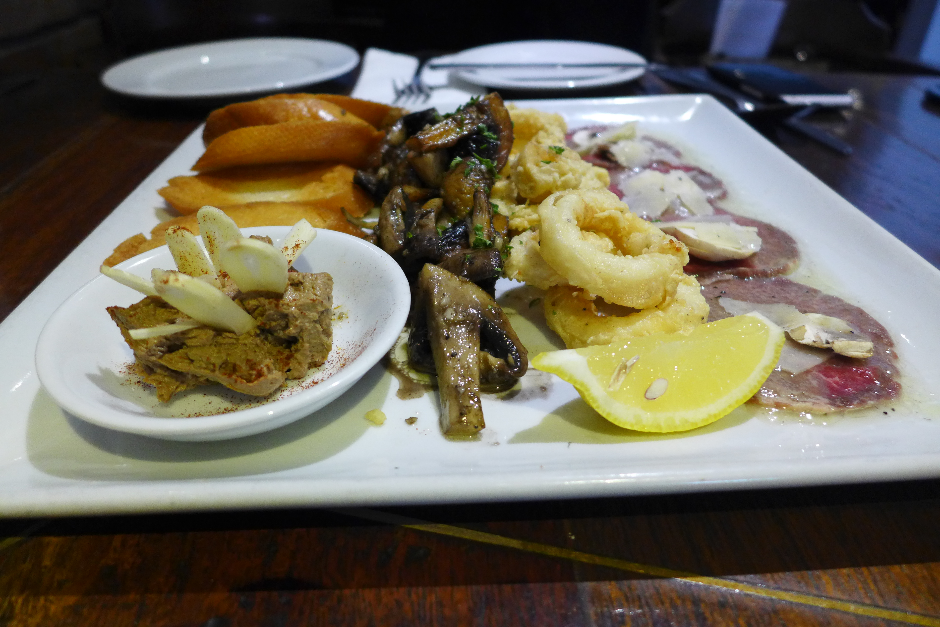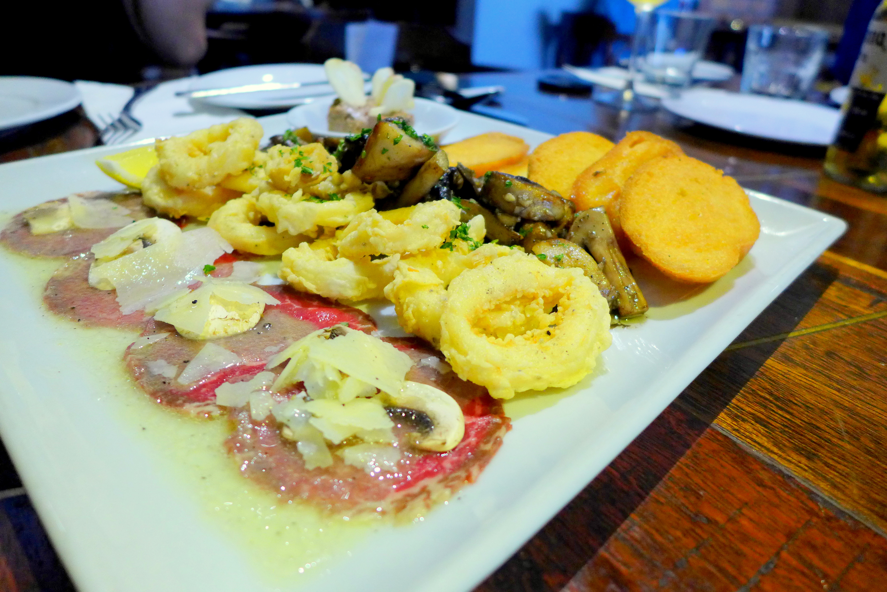 carppaccio di manzo, frittura di calamari, funghi alla  griglia & pate di fegatini con crostini