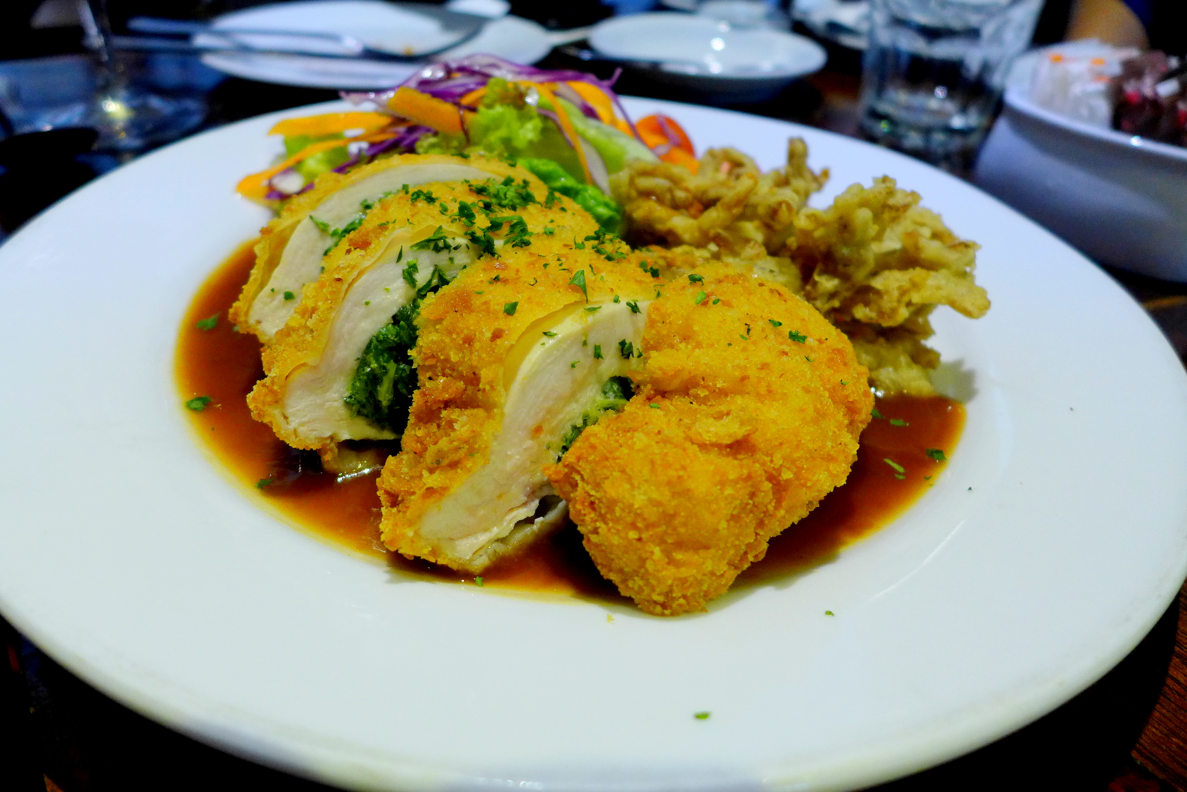 Deep-fried bread crumbed chicken breast stuffed with ricotta & spinach