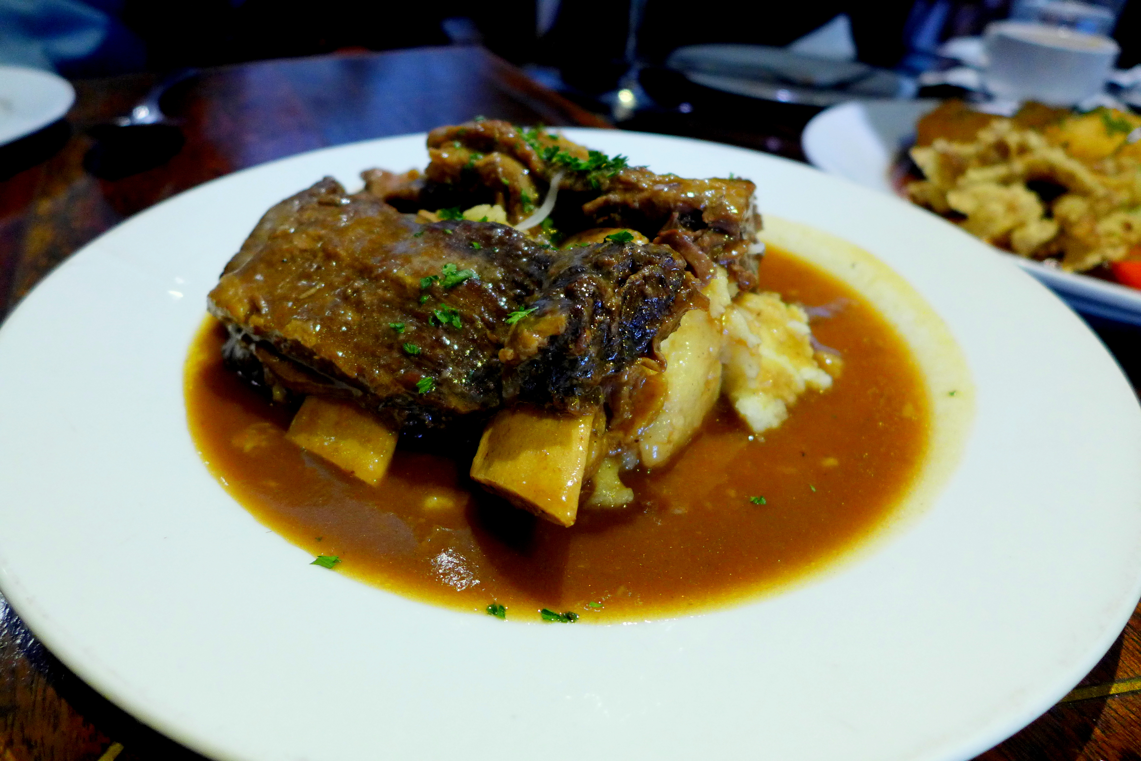 Wood fired oven roasted beef ribs in a reduction of red wine sauce on a