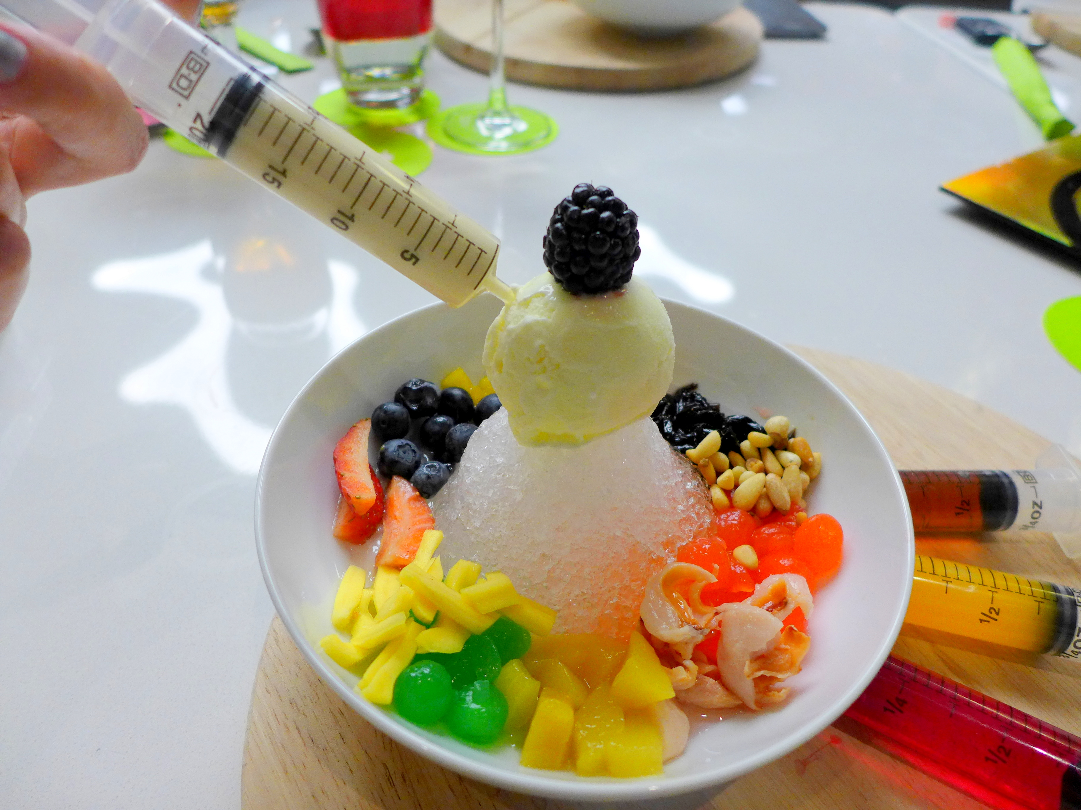 Call me nerdy but any food item presented in lab or medical appliances gets me pretty excited. Before getting the injection on, let’s see what we have here in the bowl: jackfruit, sweet potato, sago, cendol, black jelly, blackberries, strawberries and blue berries and of course a scoop of ice cream as cherry on the cake. As for the syringes: they are filled with colorful syrup including yellow – orange + lemongrass, red – rose + strawberry, green – pandan + apple, brown – salted palm sugar, white – cornflakes creamer.