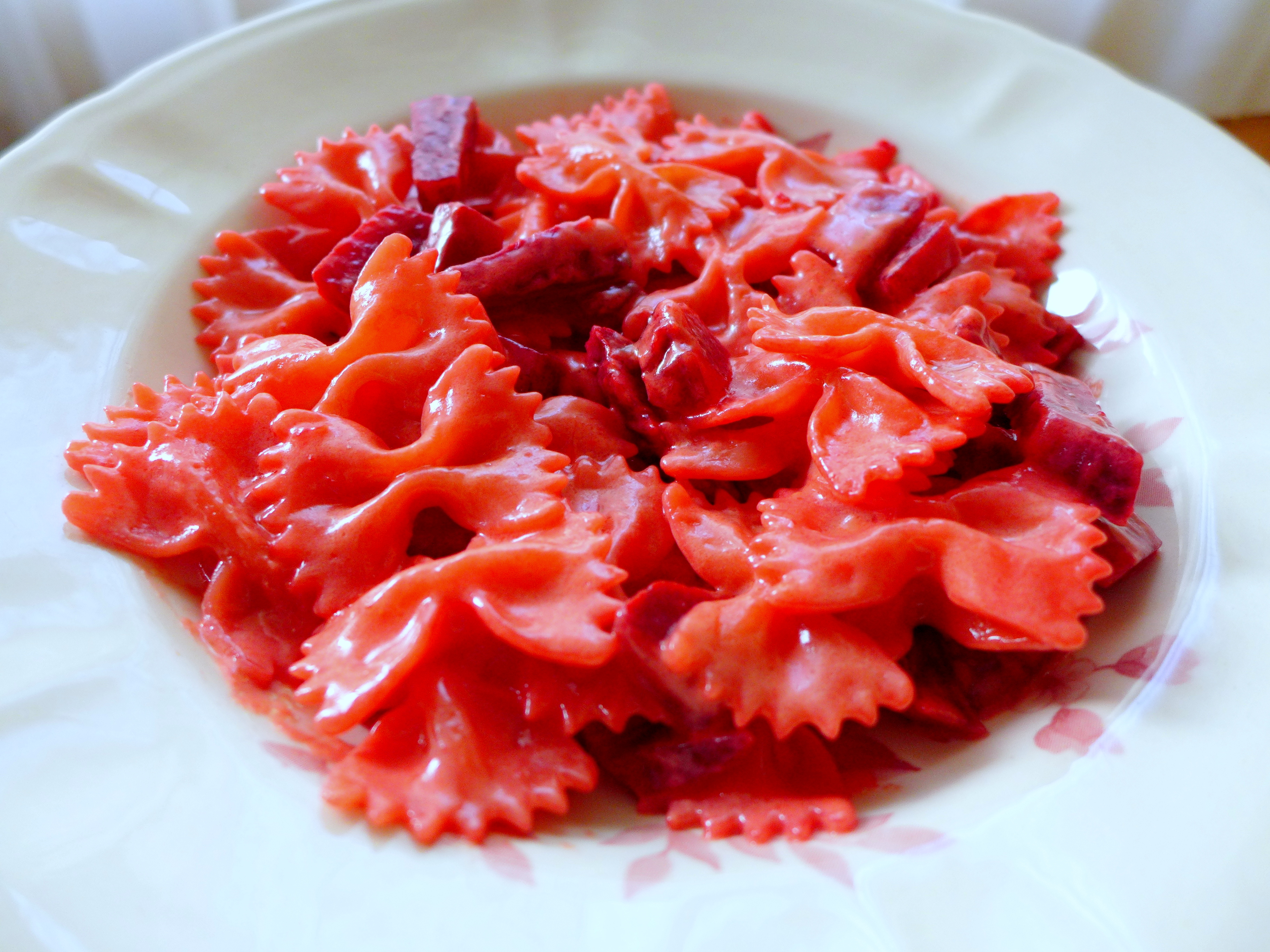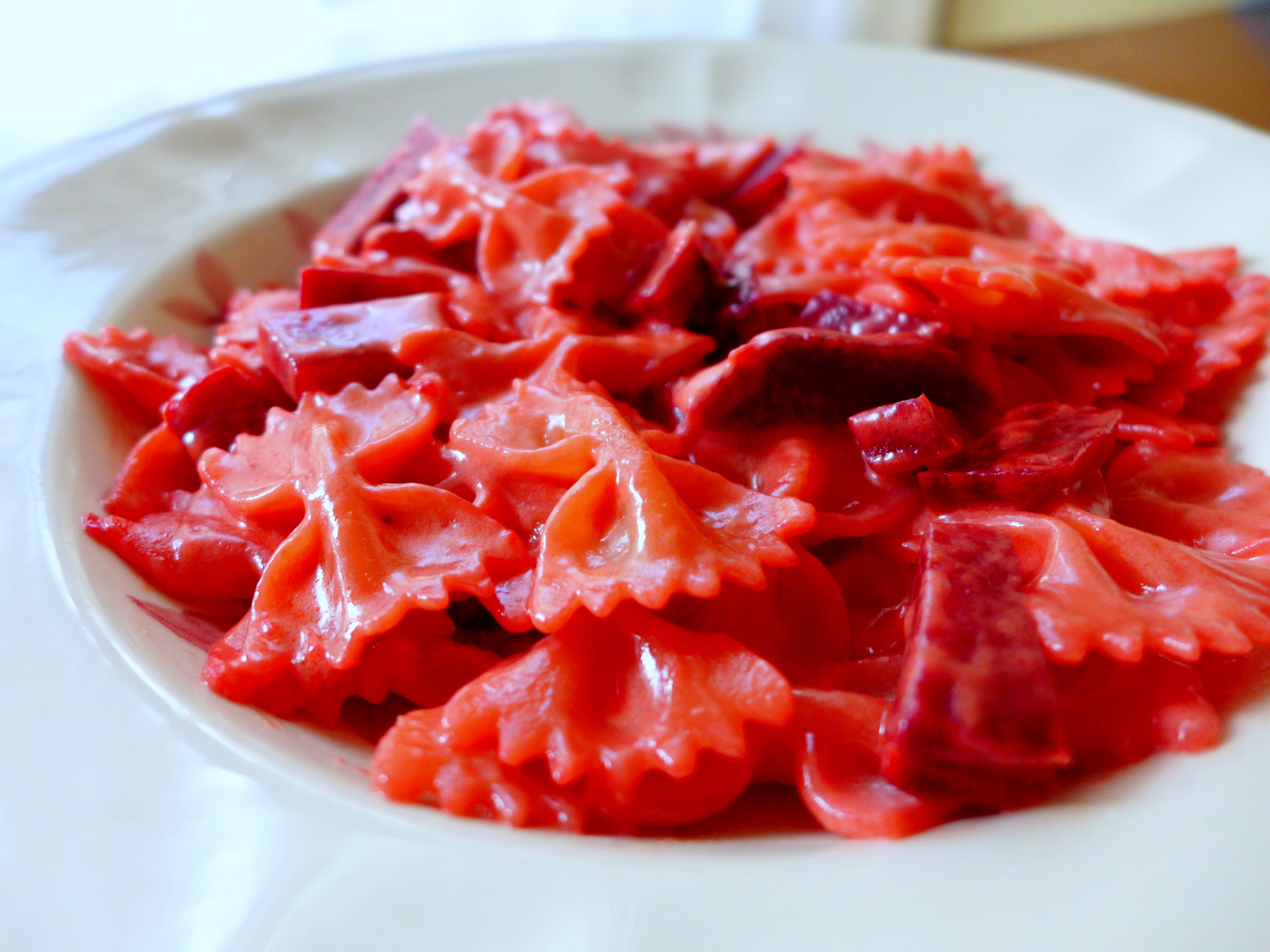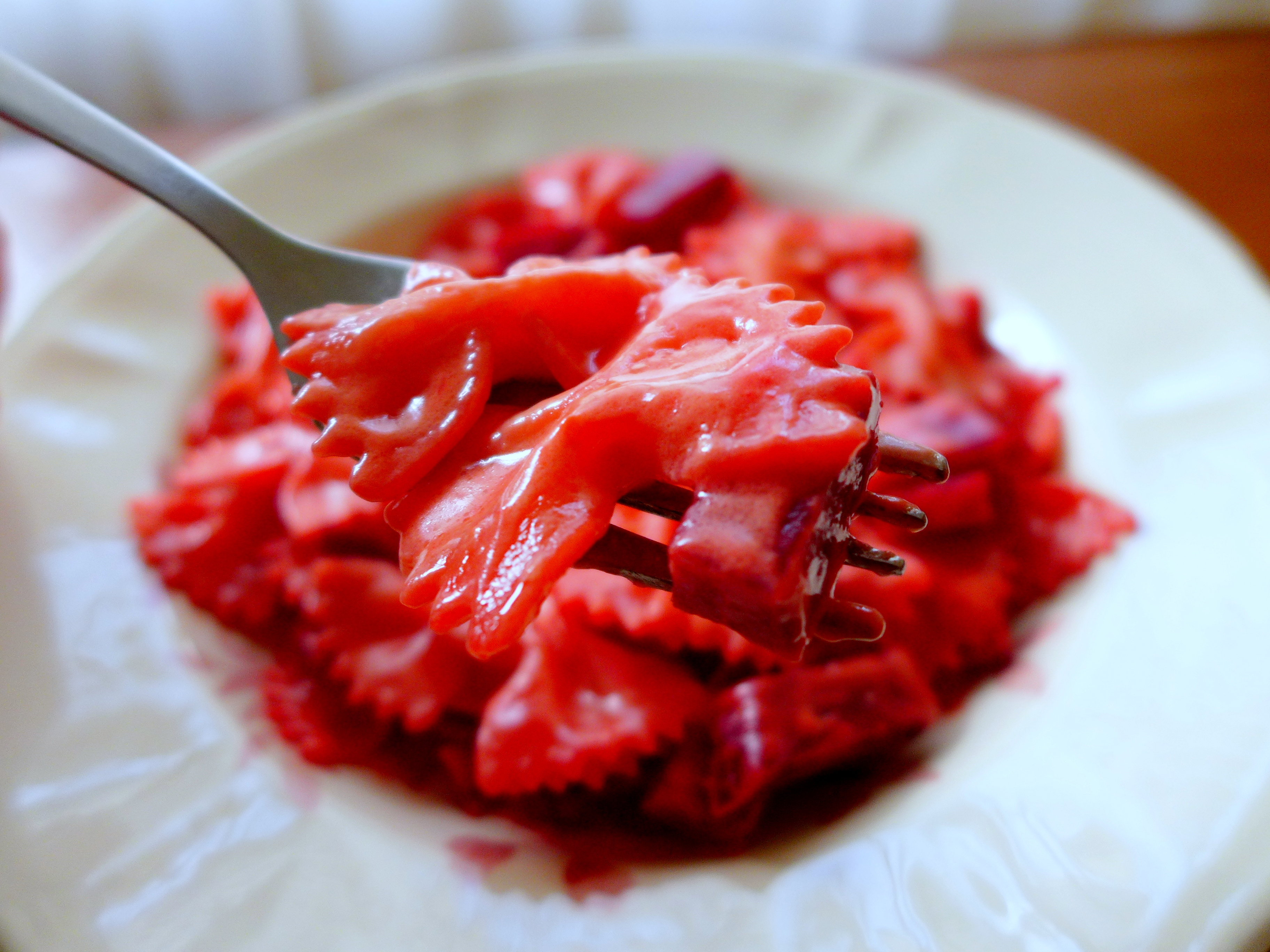 Once the pasta is cooked, drain (reserving some pasta water if needed) and add to the beetroot/cream mixture, stir in the parmesan cheese, then stir until the colour is evenly pink. Serve hot.