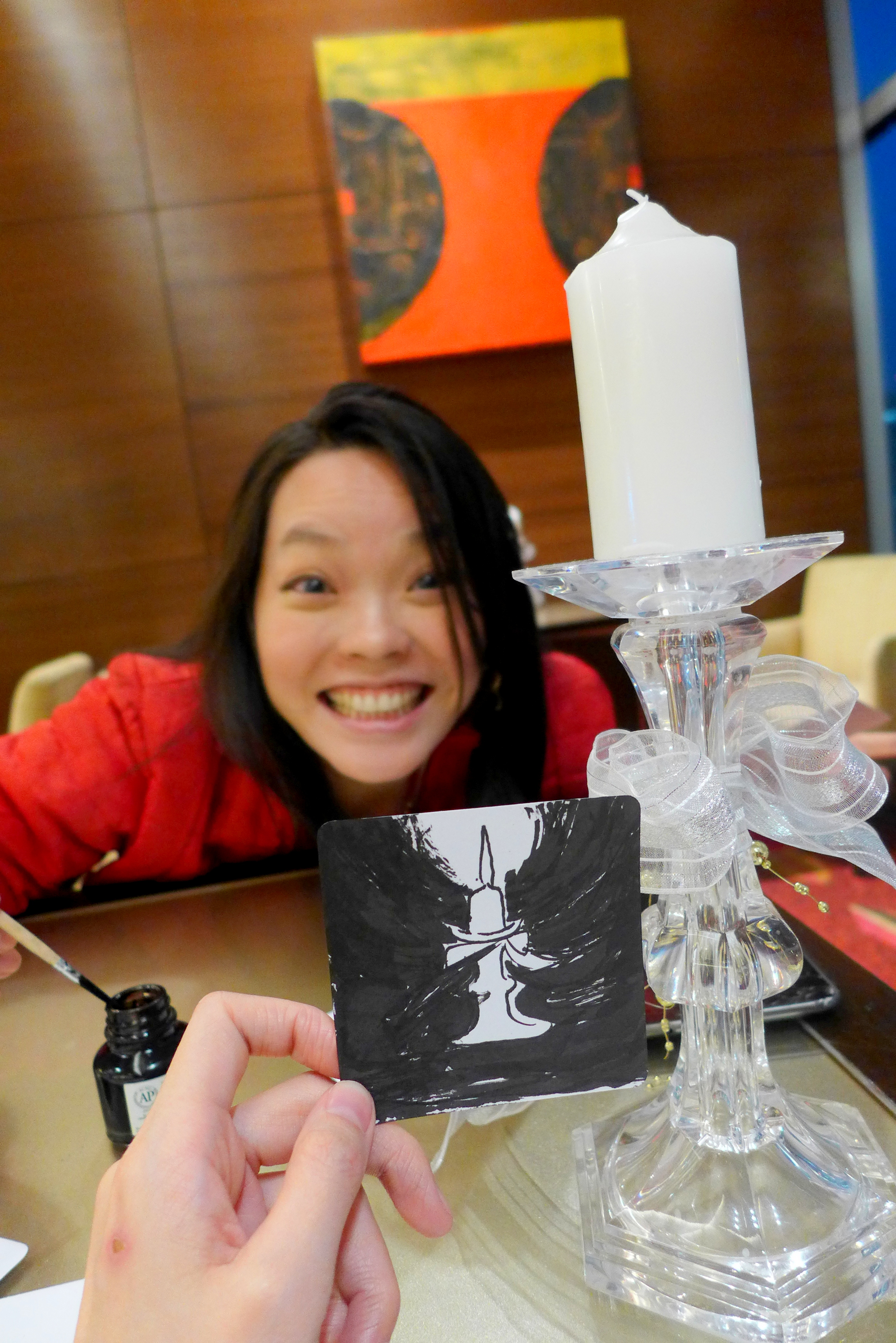 I brought her to the Traders Club Lounge and we got increasingly loud and obnoxious (haha, sorry!) but she managed to churn out a few cute art pieces, drawn on coasters.