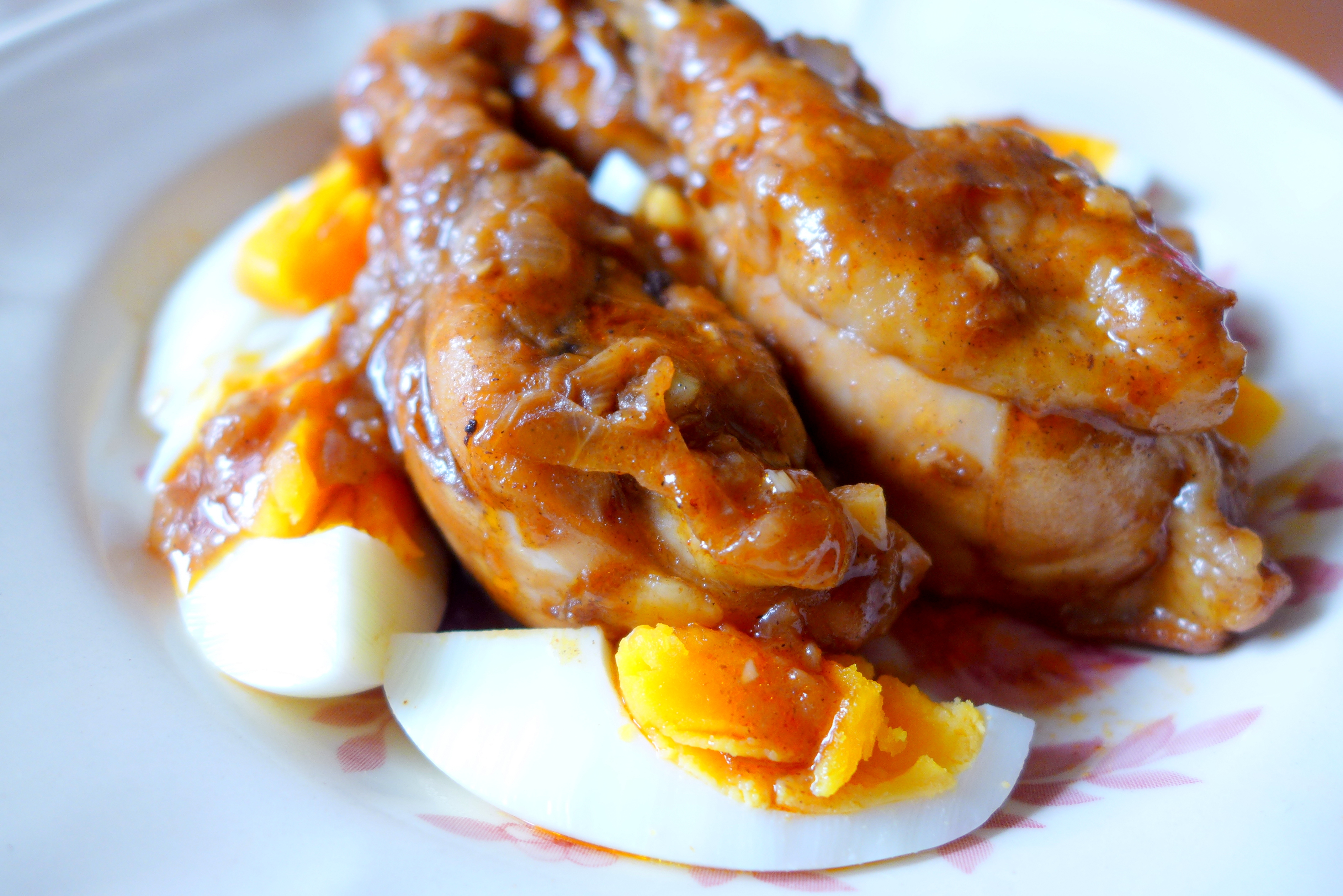 To serve, cut up the hard boiled eggs into wedges, place a few drumsticks on a plate surrounded with eggs, then pour the delicious sauce over.