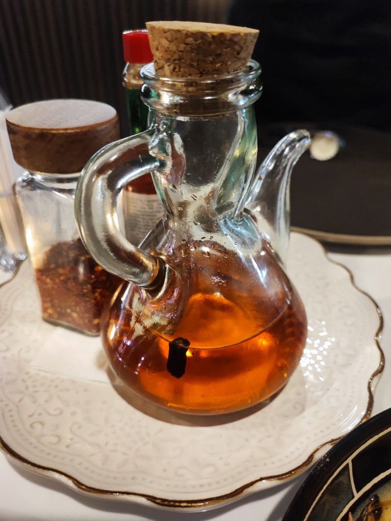 The staff brought over this gorgeous chili oil and chili flakes because we couldn’t resist ordering their pizza! They explained that their pizzas are supposed to be single slice but when it arrived, I think the proper way to describe it is more of a personal pizza size. It can easily be shared between two though. Easier to show you what it looks like of course.